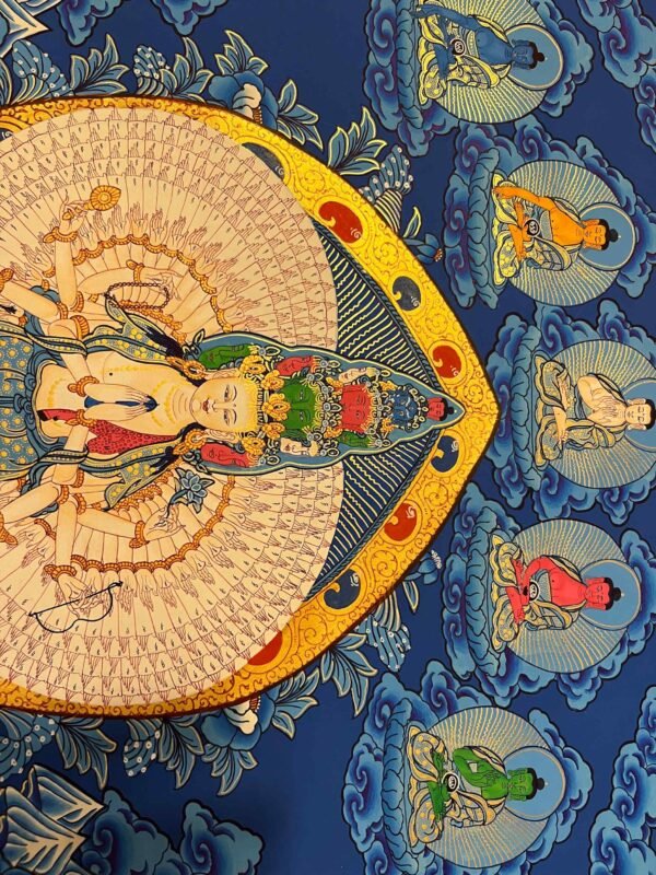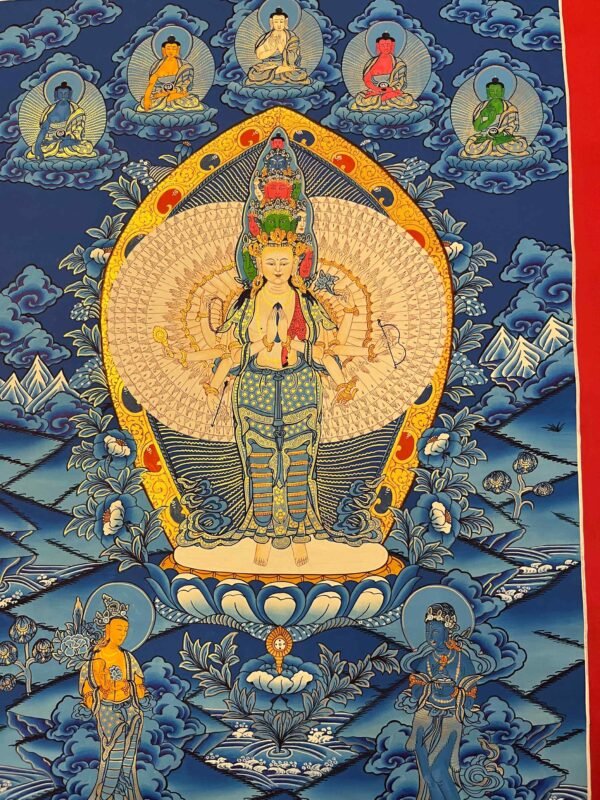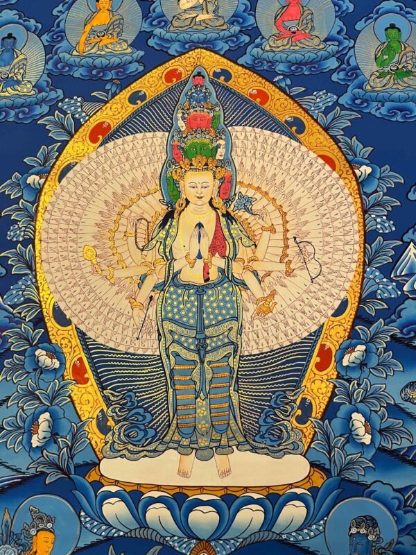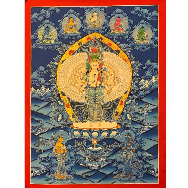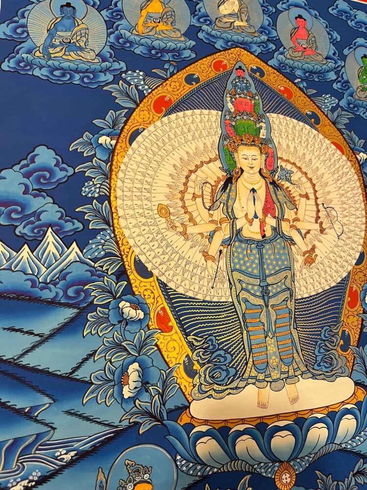 Avalokiteshvara, also known as Chenrezig is the revered Bodhisattva of Compassion in Tibetan Buddhism. Thangka paintings of Chenrezig, also known as Avalokiteshvara, is one of the most revered deities in Mahayana Buddhism. As a bodhisattva, Chenrezig has achieved complete enlightenment but chooses to remain in the world, aiding all sentient beings in their path to liberation. His compassion is boundless, and he is often depicted with multiple arms, each holding a tool to assist in his mission of salvation.