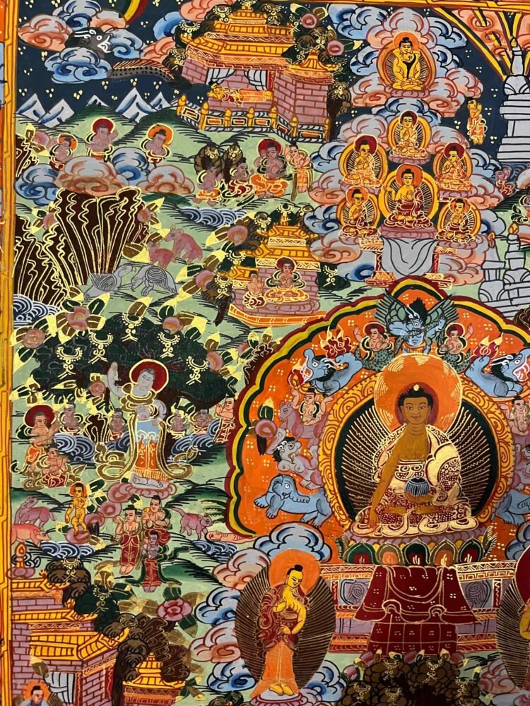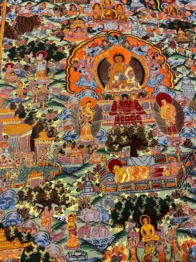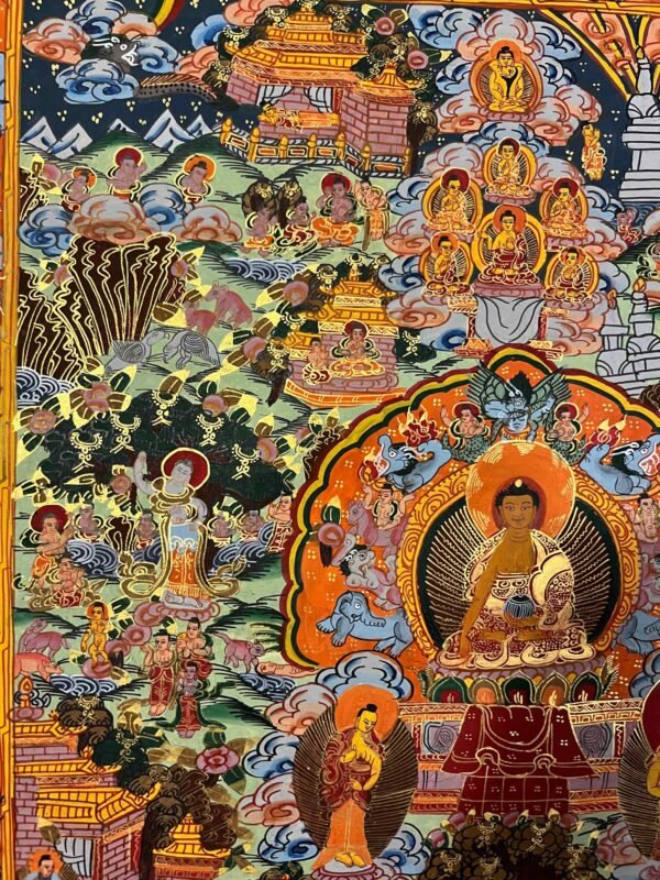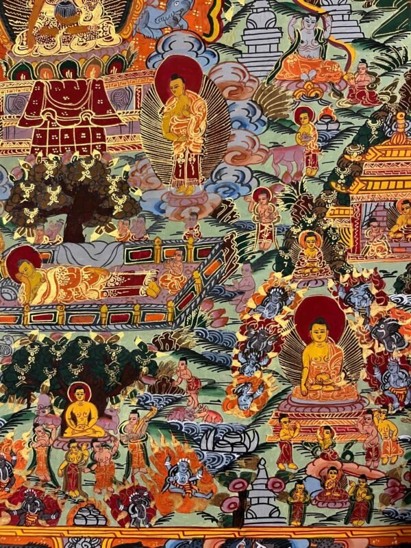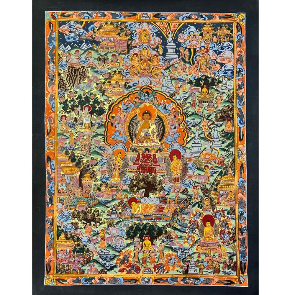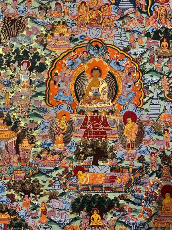 Siddhartha Gautama, from his birth, renunciation, and meditation to his enlightenment and teachings. Painted with natural mineral pigments using traditional Tibetan techniques, it is both a beautiful artwork and a spiritual guide, perfect for meditation spaces, home altars, or personal reflection.Siddhartha Gautama, was born about 2549 years ago in Lumbini, Nepal. A prince and son of King Suddhodana and Queen Mayadevi. At the age of 29, he renounced the luxury of his royal heritage to take up the life of a religious wanderer. He submitted himself to rigorous and extreme ascetic practices, putting forth a superhuman struggle for six strenuous years. At the age of 35, after gaining profound insight into the true nature of reality (Dharma), he attained complete enlightenment. For the remainder of his life, living as the perfect embodiment of all the virtues he preached, the Buddha (‘Awakened One’) traveled widely teaching the Dharma.serving as a teaching tool and meditation aid by depicting his birth, renunciation, quest for enlightenment, overcoming Mara, achieving Nirvana, and teaching others. These intricate artworks, made with mineral pigments on cotton canvas, portray his life in distinct phases: his royal life, the realization of suffering, and his path to awakening.