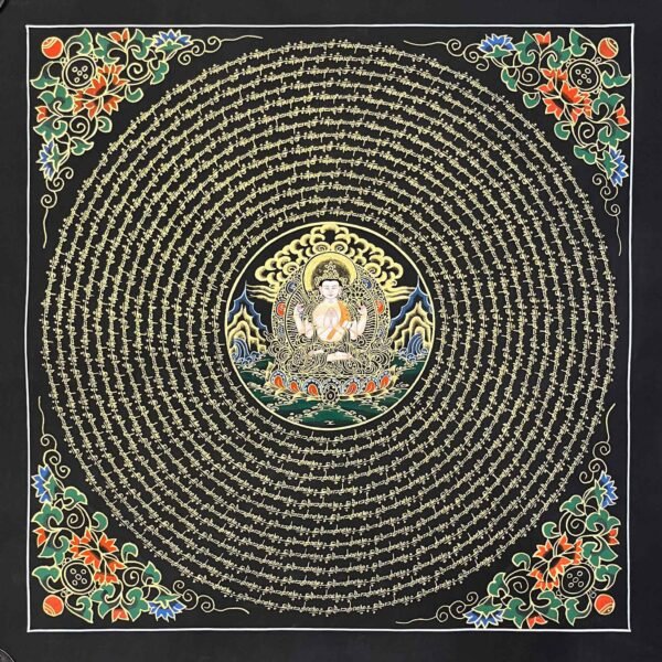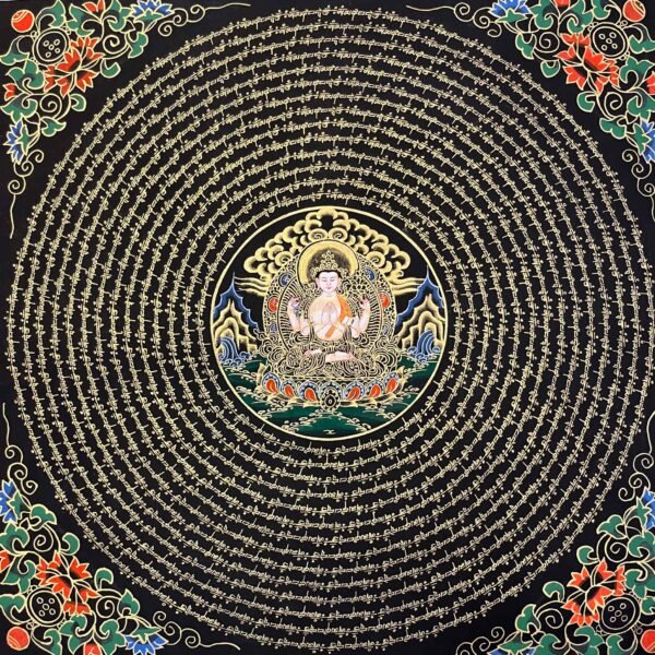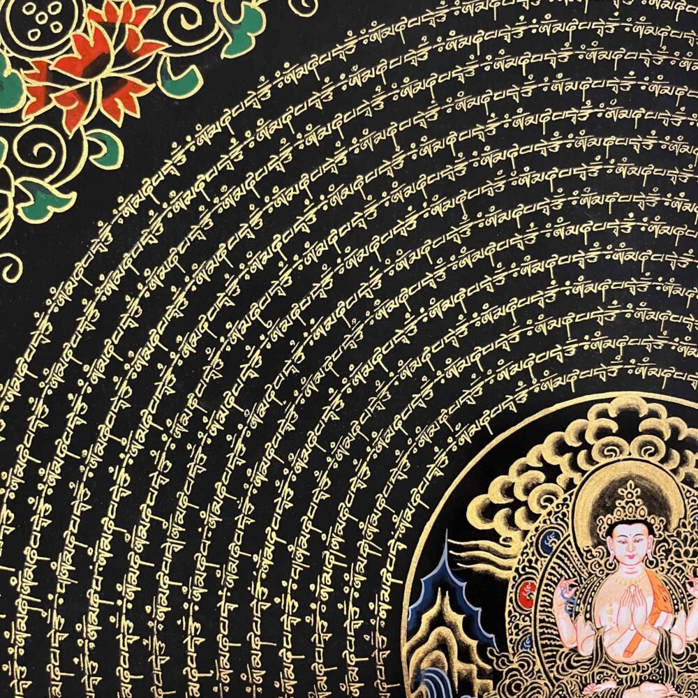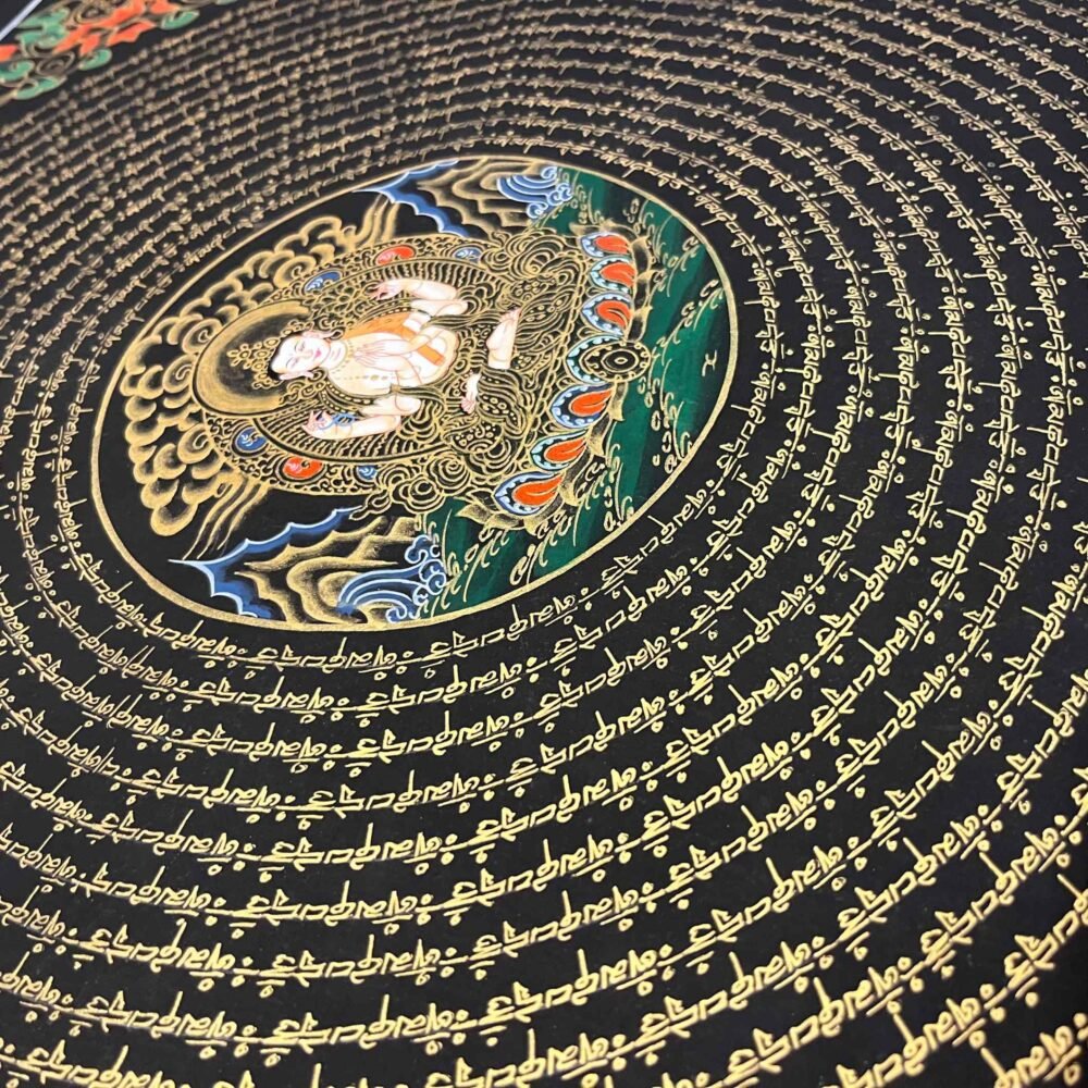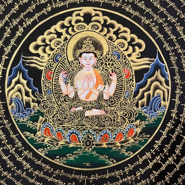 A Chenrezig mantra mandala thangka is a sacred Tibetan Buddhist painting often hand -painted on cotton using mineral pigments ,featuring the Bodhisattva of compassion,chenrezig (Avalokiteshvara ),at its center Surrounded by the “Om Mani Padme Hum” mantra and intricate geometric designs, it represents universal compassion, wisdom, and the cosmos, serving as a powerful tool for meditation, healing, and spiritual focus.