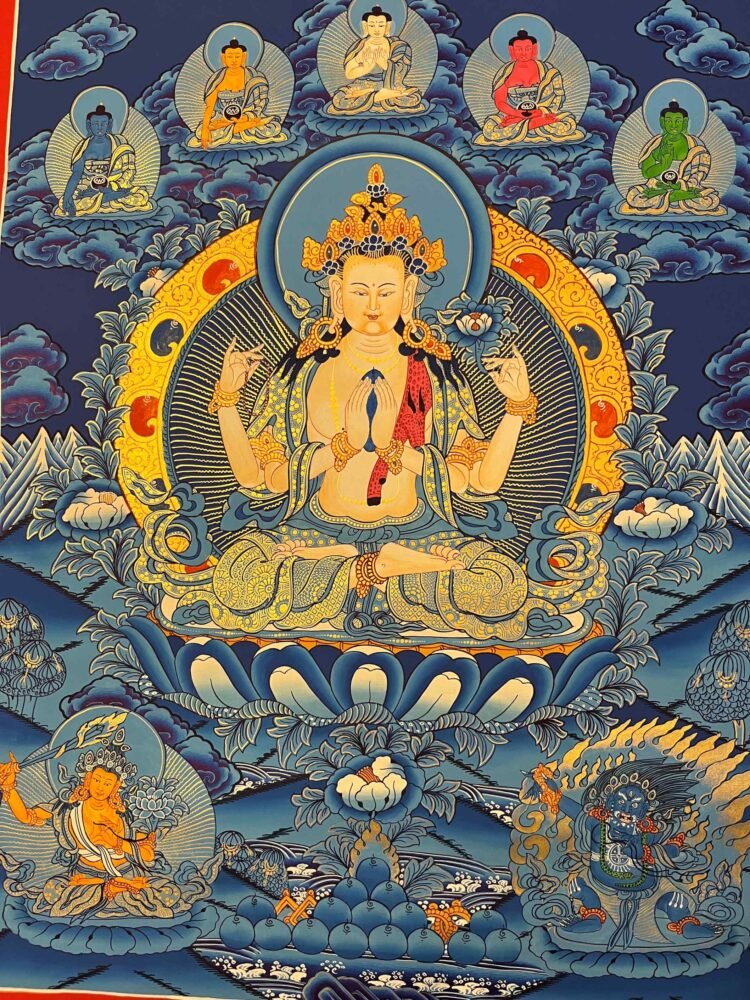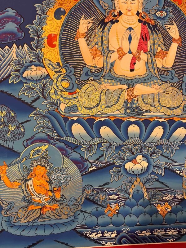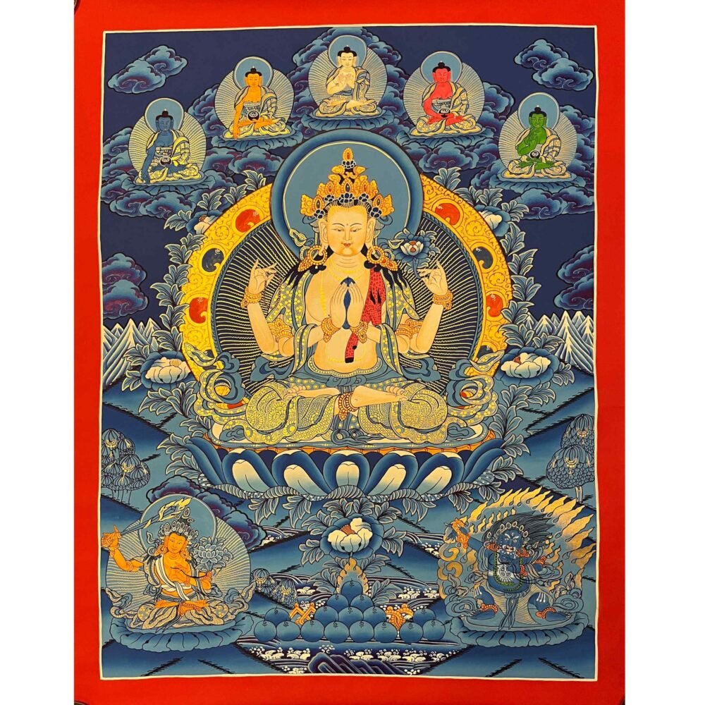 Chenrezig, also known as Avalokiteshvara, is the revered Bodhisattva of Compassion in Tibetan Buddhism. Thangka paintings of Chenrezig, also known as Avalokiteshvara, is one of the most revered deities in Mahayana Buddhism. As a bodhisattva, Chenrezig has achieved complete enlightenment but chooses to remain in the world, aiding all sentient beings in their path to liberation. His compassion is boundless, and he is often depicted with multiple arms, each holding a tool to assist in his mission of salvation.