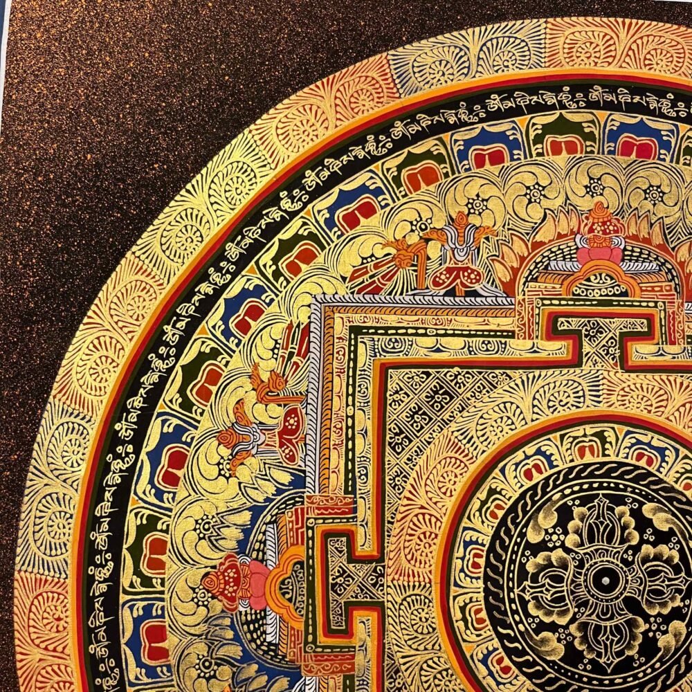 Mandala, a circle that is a device for the Tantric meditation. It is visual aid for concentration and introversive meditation leading to the attainment of insights and to activation of forces culminating in “Siddhi”, supernatural forces. The mandala is the graphic representation of this process. It is not only theoretical but practical also as an instrument (yantra). There are many types and varieties of mandalas depending on the nature of central deity. The most classic pattern of mandalas are of Dhyani Buddha. This mandala represents “Palace of Purity” a magic surrounded by circle of flame, vajra, eight centuries (appears only with wrathful deities), lotus and then the inner square to reach of the dity of the mandala. Structure: Generally, mandala is sketched inside circles. Those circles are of four types: Flame of burning fire, Cremation, Wind and Lotus flower (sometimes vajara in the case of wind). The flame of burning fire is the sign of the destroyer of impurity and unknowledge contained in us. After the circle of cremation, there’s a circle of Vajra, is the sign of knowledge or enlighten and no difficulties or problems can shake the knowledge. After crossing these four circles a square room appears which is the sign of the spiritual temple.
