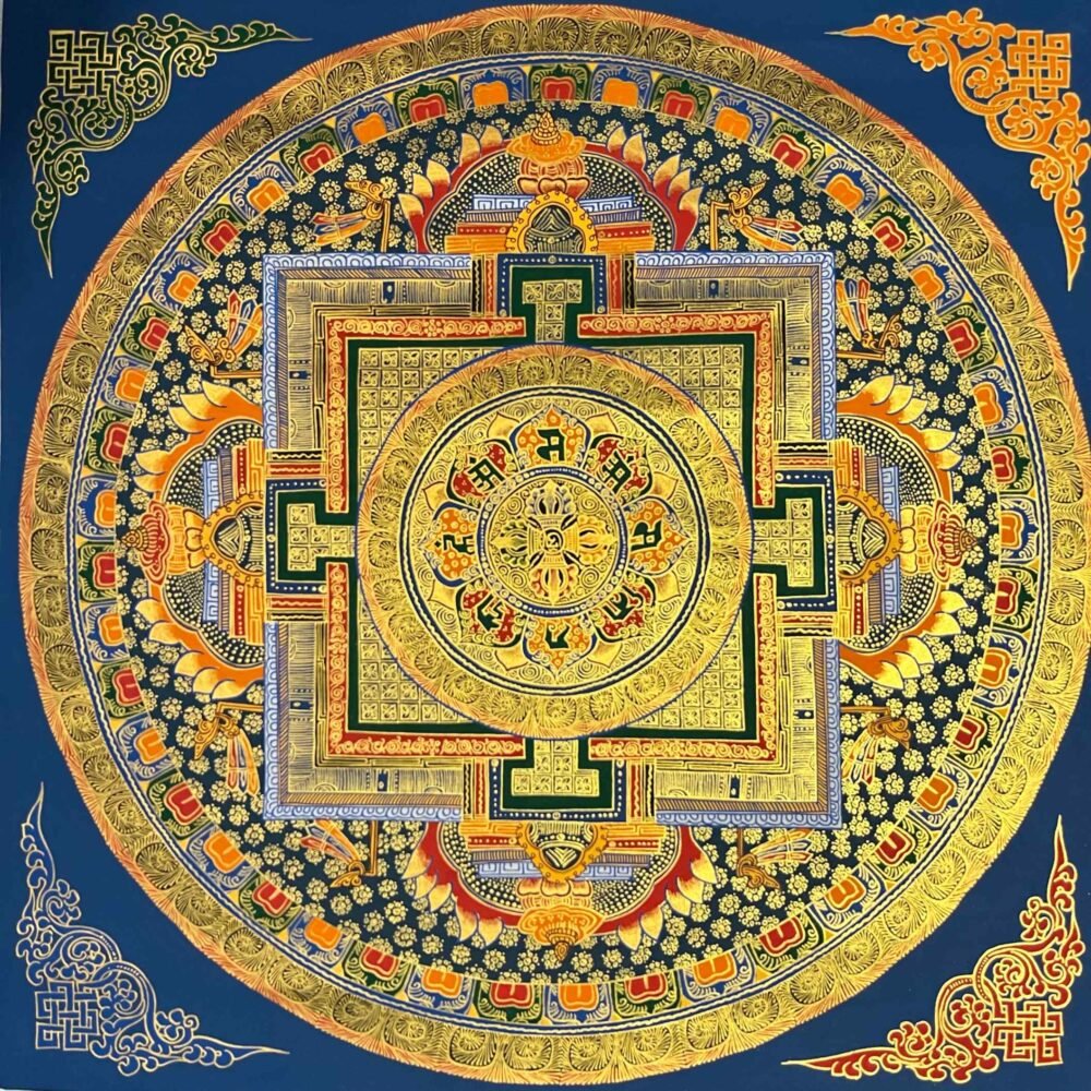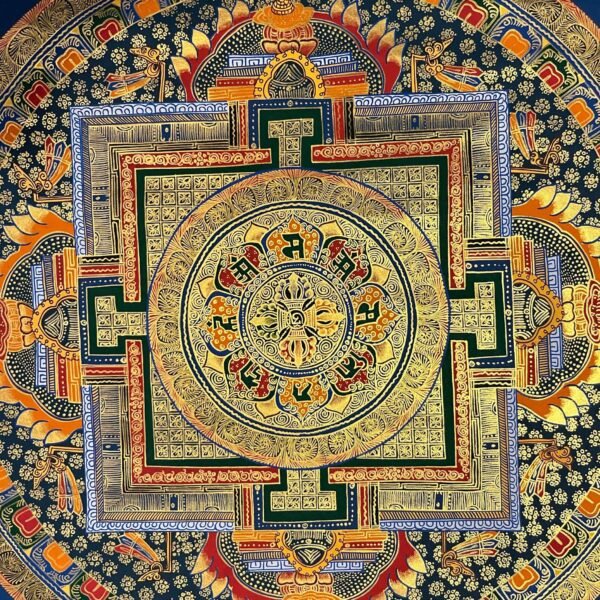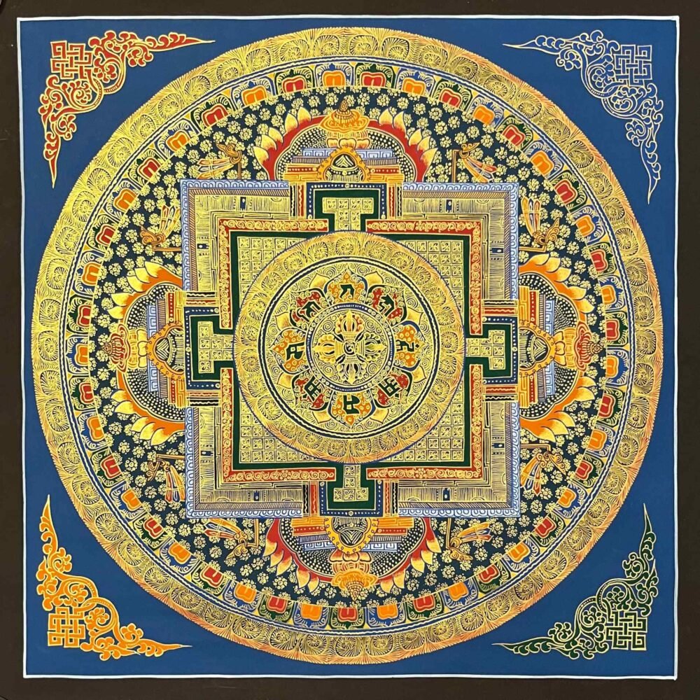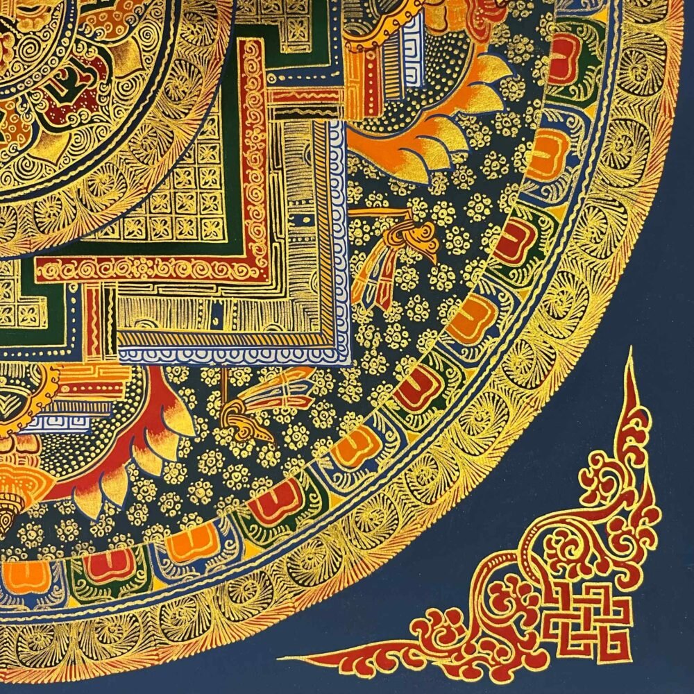 Mandala, a circle that is a device for the Tantric meditation. It is visual aid for concentration and introversive meditation leading to the attainment of insights and to activation of forces culminating in “Siddhi”, supernatural forces. The mandala is the graphic representation of this process. It is not only theoretical but practical also as an instrument (yantra). There are many types and varieties of mandalas depending on the nature of central deity. The most classic pattern of mandalas are of Dhyani Buddha. This mandala represents “Palace of Purity” a magic surrounded by circle of flame, vajra, eight centuries (appears only with wrathful deities), lotus and then the inner square to reach of the dity of the mandala. Structure: Generally, mandala is sketched inside circles. Those circles are of four types: Flame of burning fire, Cremation, Wind and Lotus flower (sometimes vajara in the case of wind). The flame of burning fire is the sign of the destroyer of impurity and unknowledge contained in us. After the circle of cremation, there’s a circle of Vajra, is the sign of knowledge or enlighten and no difficulties or problems can shake the knowledge. After crossing these four circles a square room appears which is the sign of the spiritual temple.