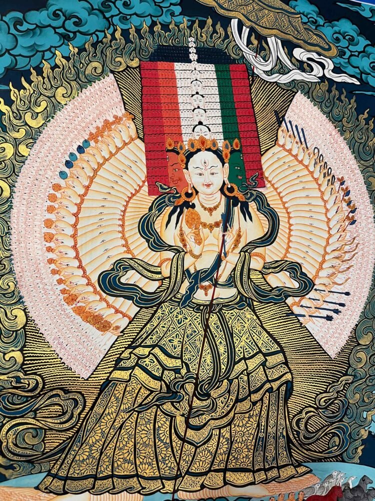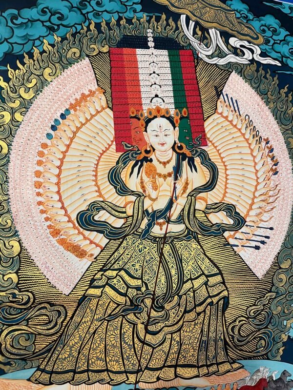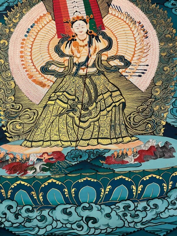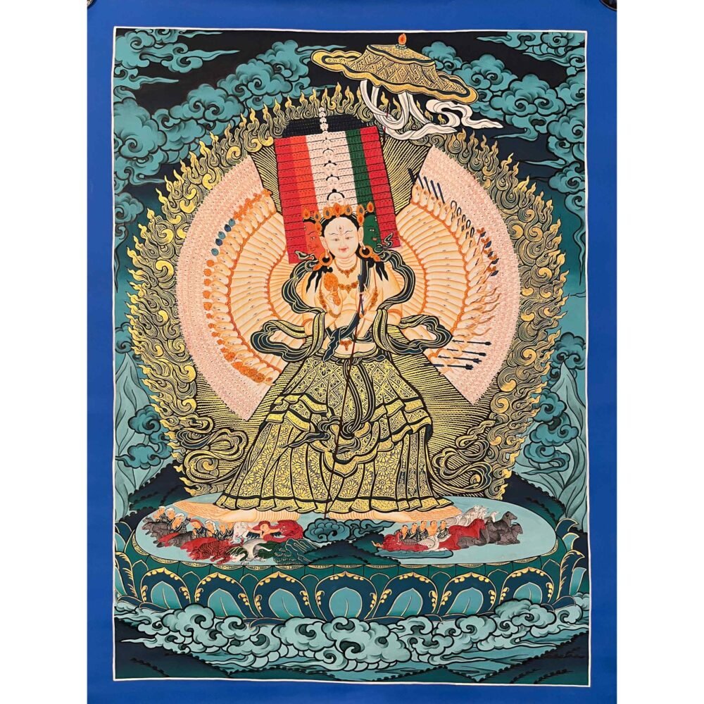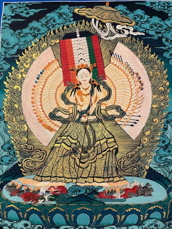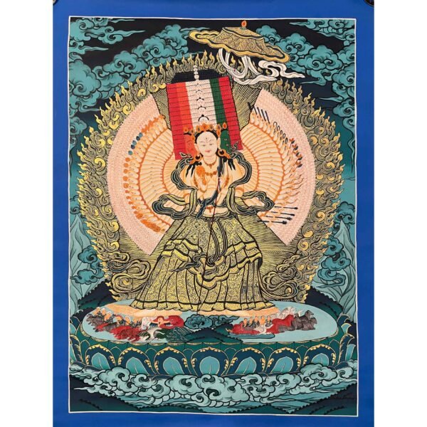 A Dukar Thangka is a sacred Tibetan Buddhist scroll painting depicting Sitatapatra ,the Goddess of the white Umbrella. Â She is revered as a powerful deity of protection and purification, believed to shield practitioners from negative energies, illness, and obstacles.Bring home the powerful presence of , the White Umbrella Goddess, with this exquisitely a sacred blend of artistic mastery and spiritual symbolism.Dukkar is represented in the thangka as a white-colored deity, with a distinctive white umbrella symbolizing her protective abilities. She is seen with the Protective Mudra, a hand gesture that conveys her intention to defend and preserve all beings from physical, emotional, and spiritual peril. This mudra serves as an emblem of Dukkar’s protection, and it is believed that by staying aware of the gesture, one can attract its protective powers.
