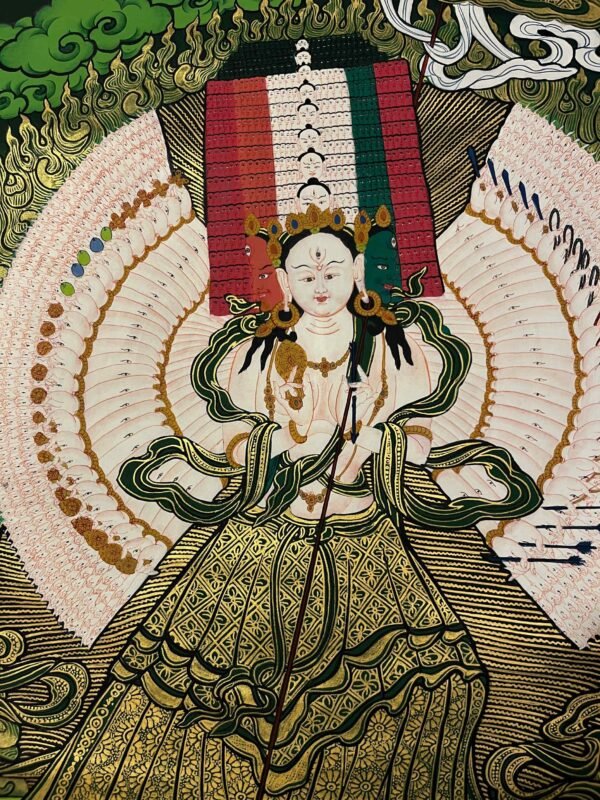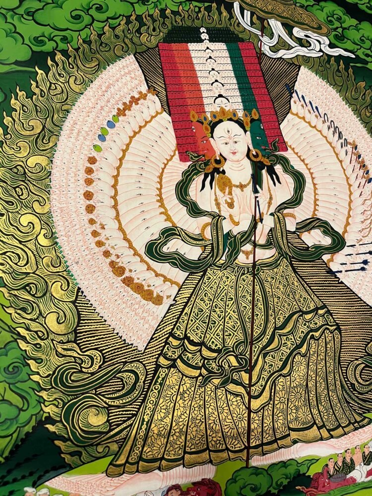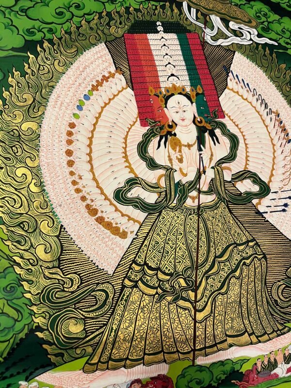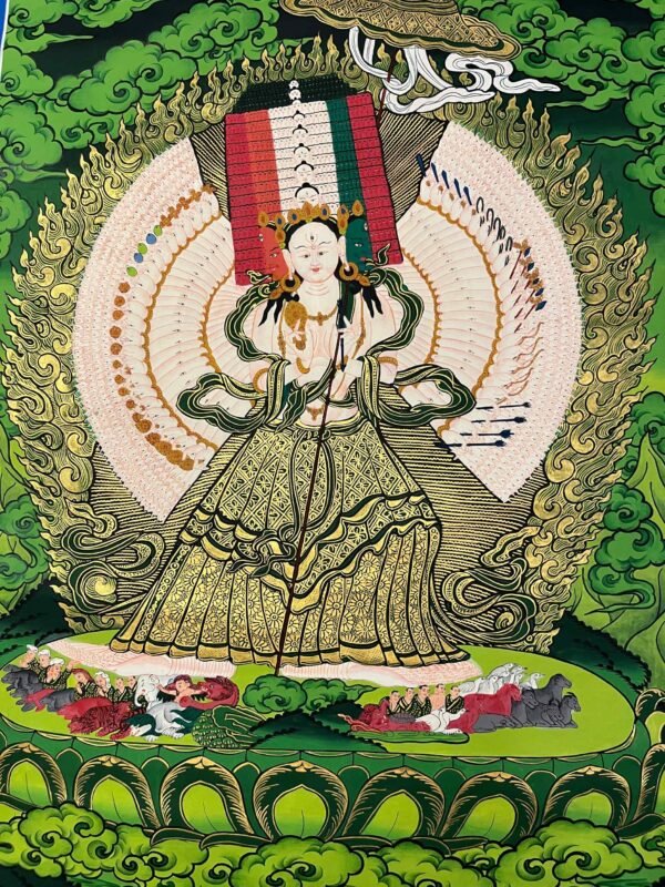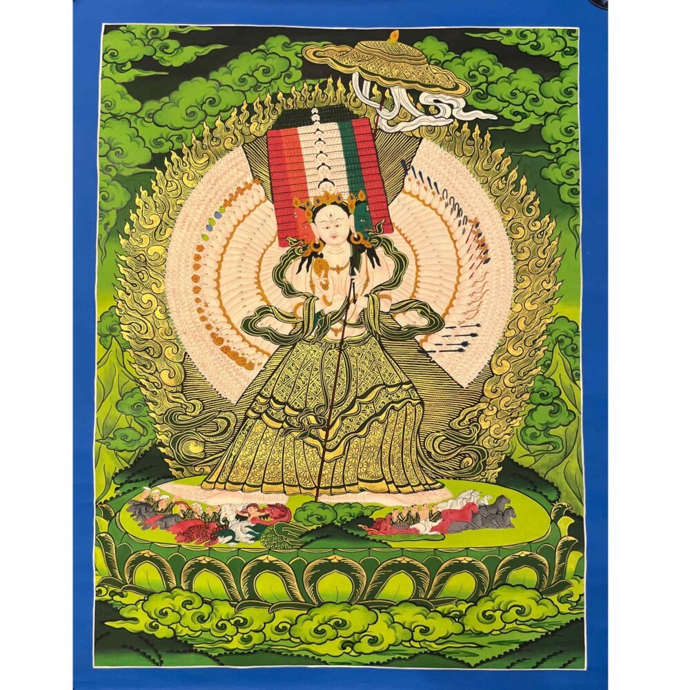 A Dukar Thangka is a sacred Tibetan Buddhist scroll painting depicting Sitatapatra ,the Goddess of the white Umbrella.  She is revered as a powerful deity of protection and purification, believed to shield practitioners from negative energies, illness, and obstacles.Bring home the powerful presence of , the White Umbrella Goddess, with this exquisitely a sacred blend of artistic mastery and spiritual symbolism.Dukkar is represented in the thangka as a white-colored deity, with a distinctive white umbrella symbolizing her protective abilities. She is seen with the Protective Mudra, a hand gesture that conveys her intention to defend and preserve all beings from physical, emotional, and spiritual peril. This mudra serves as an emblem of Dukkar’s protection, and it is believed that by staying aware of the gesture, one can attract its protective powers.