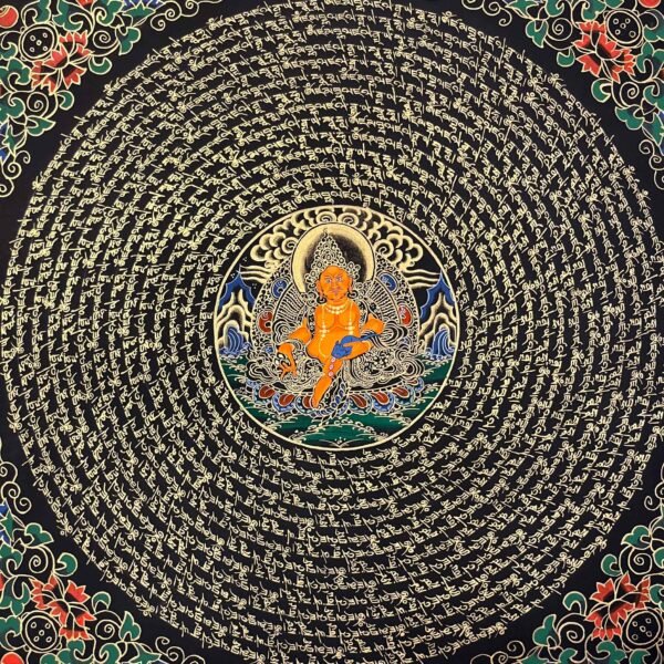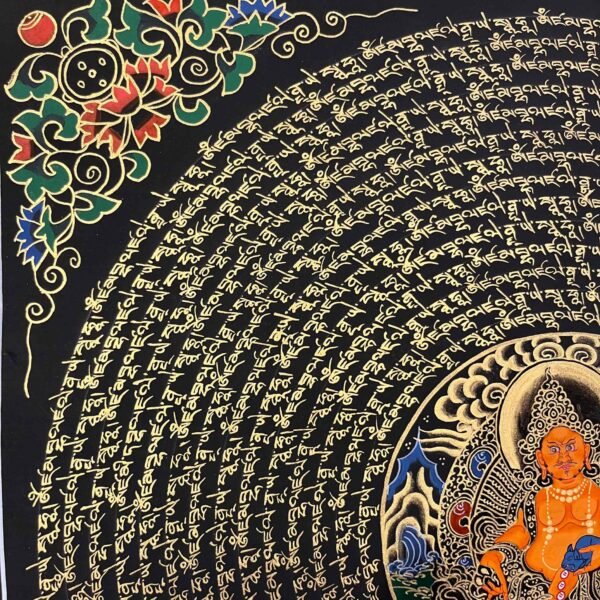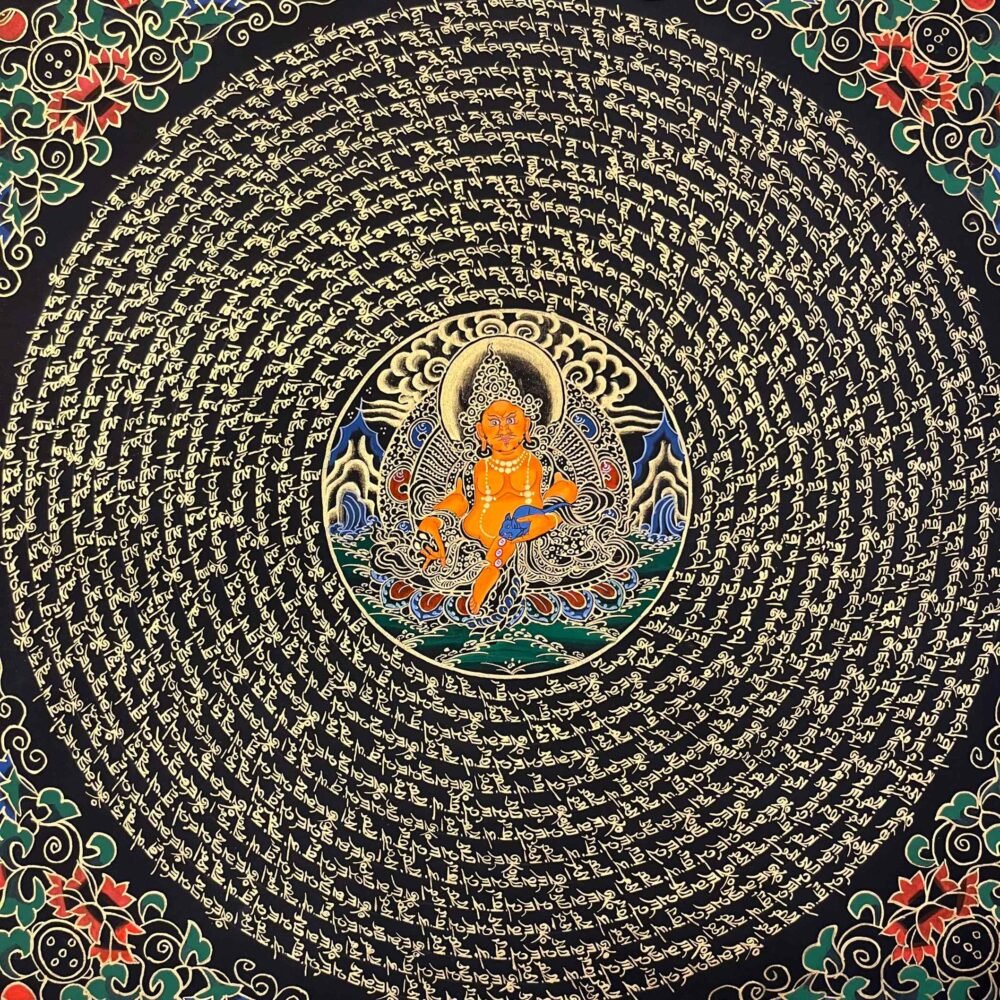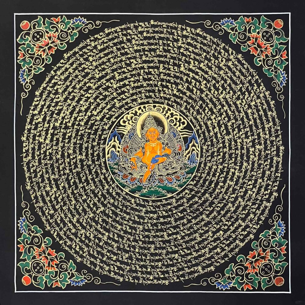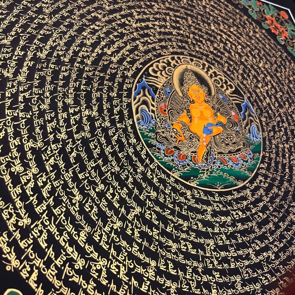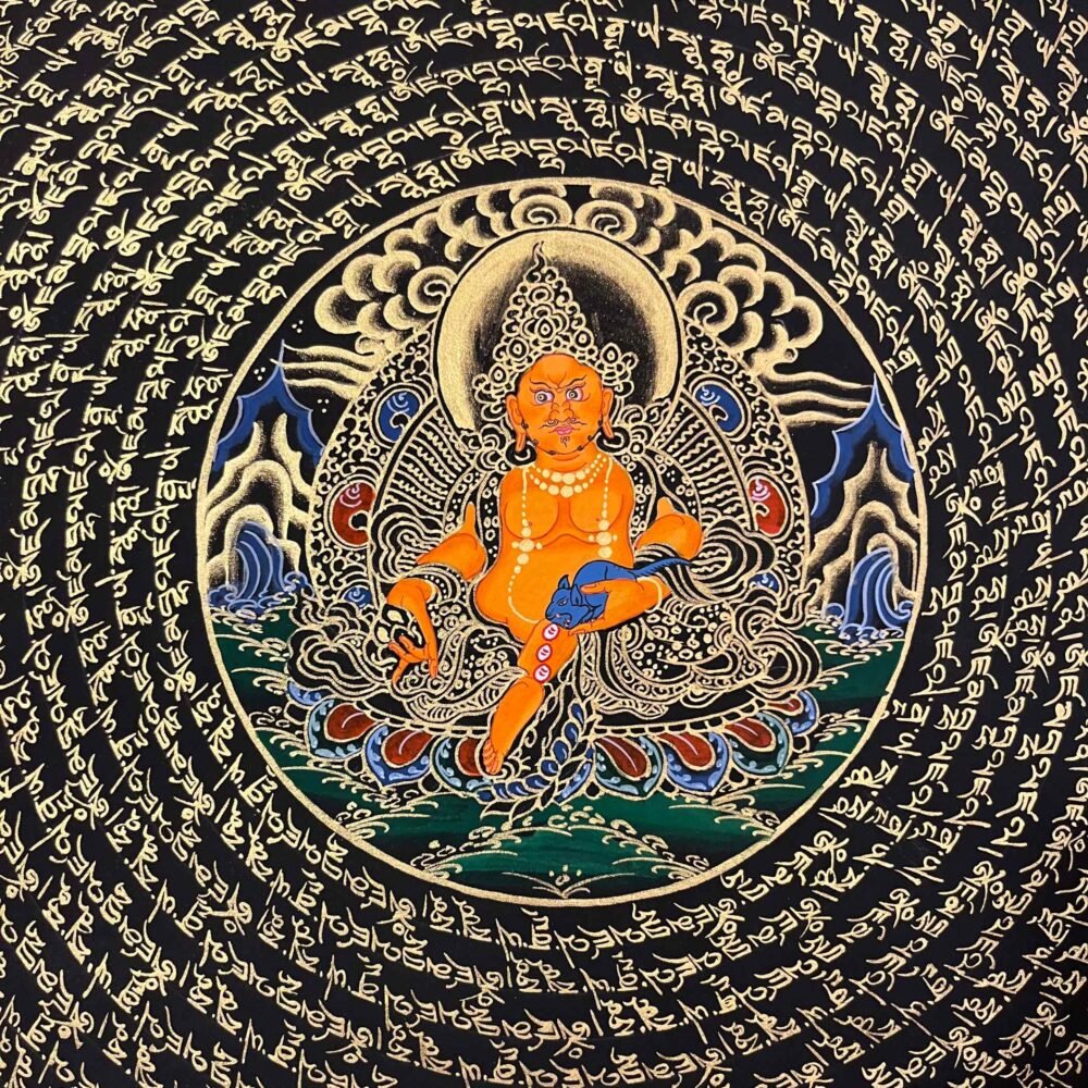 A Zambala Mantra Mandala Thangka is a sacred Tibetan Buddhist painting feacturing Zambala(jambhala),the deity of wealth ,fortune ,and prosperity,surrounded by his mantra ,typically in a circlar geometric mandala. The mantras “Om Dzambhala Dzalin Draye Soha ” is a powerful Buddhist chant used to attract wealth ,increase prosperity ,and reduce poverty ,As an emanation of Buddha Ratnasambhava ,he is often worshipped for financial stability,with the practice commonly involving pouring water over his statue to symbolize the flow of prosperity.