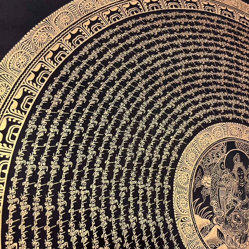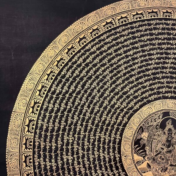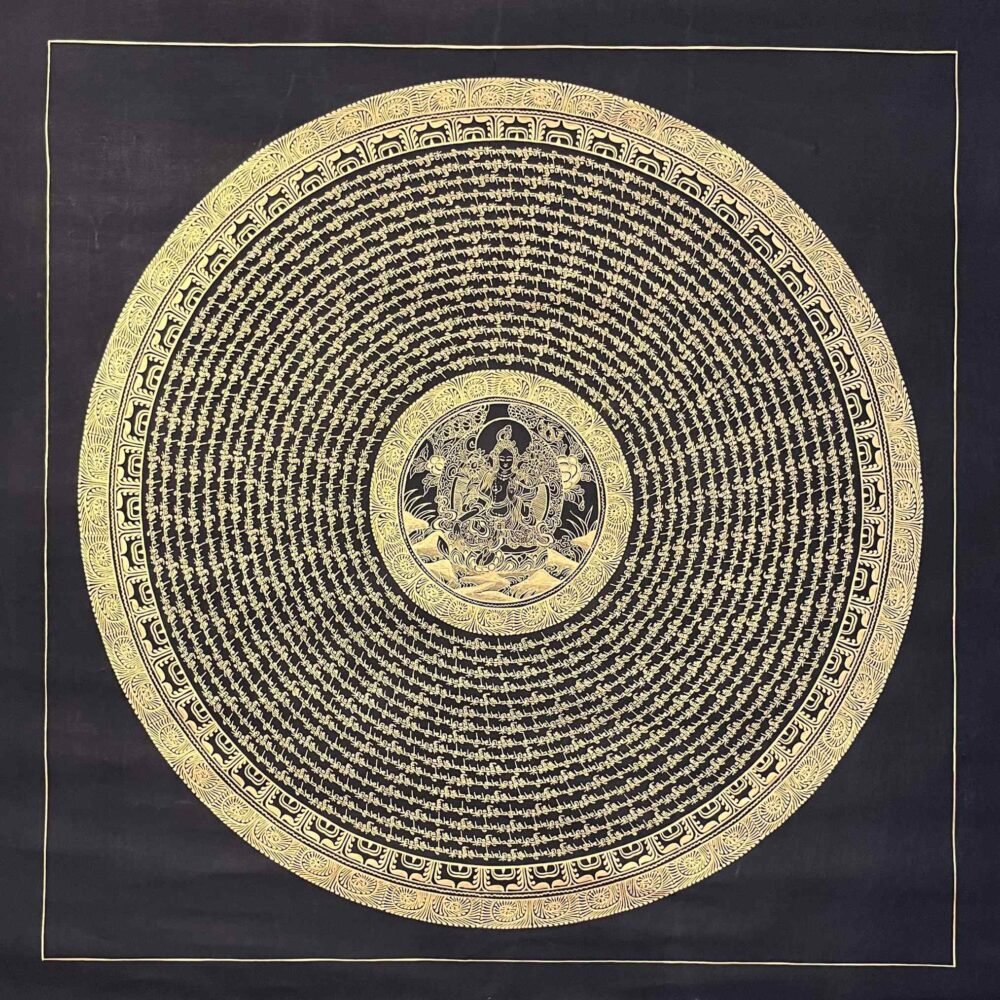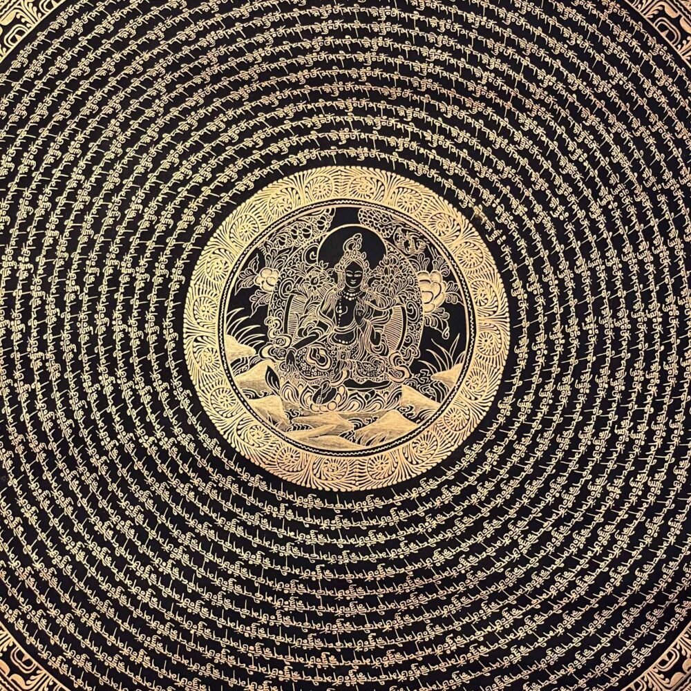 A Green Tara Mantra Mandala Thangka is a sacred Tibetan Buddhist painting featuring the goddess of compassion ,,Green Tara surrounded by her mantra radiating pattern . These, intricate, artworks symbolize, protection, healing, and the, elimination of fear, often used for, meditation and spiritual focus.The mantra “Om Tare Tuttare Ture Soha” is usually inscribed around her, representing the sound of the universe, and the clearing of obstacles and fear. Used to create a,, peaceful, and, focused atmosphere and Placed on personal, altars, for, daily, devotion. Enhances, positive, energy and, brings, spiritual,, ambiance.This thangka is ideal for meditation, spiritual practice, or as a sacred wall art to bring harmony and protection into your home or altar space.