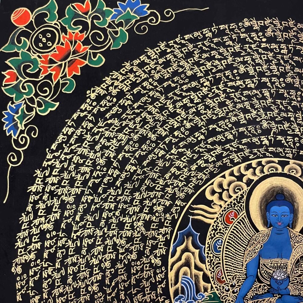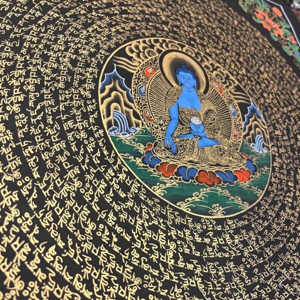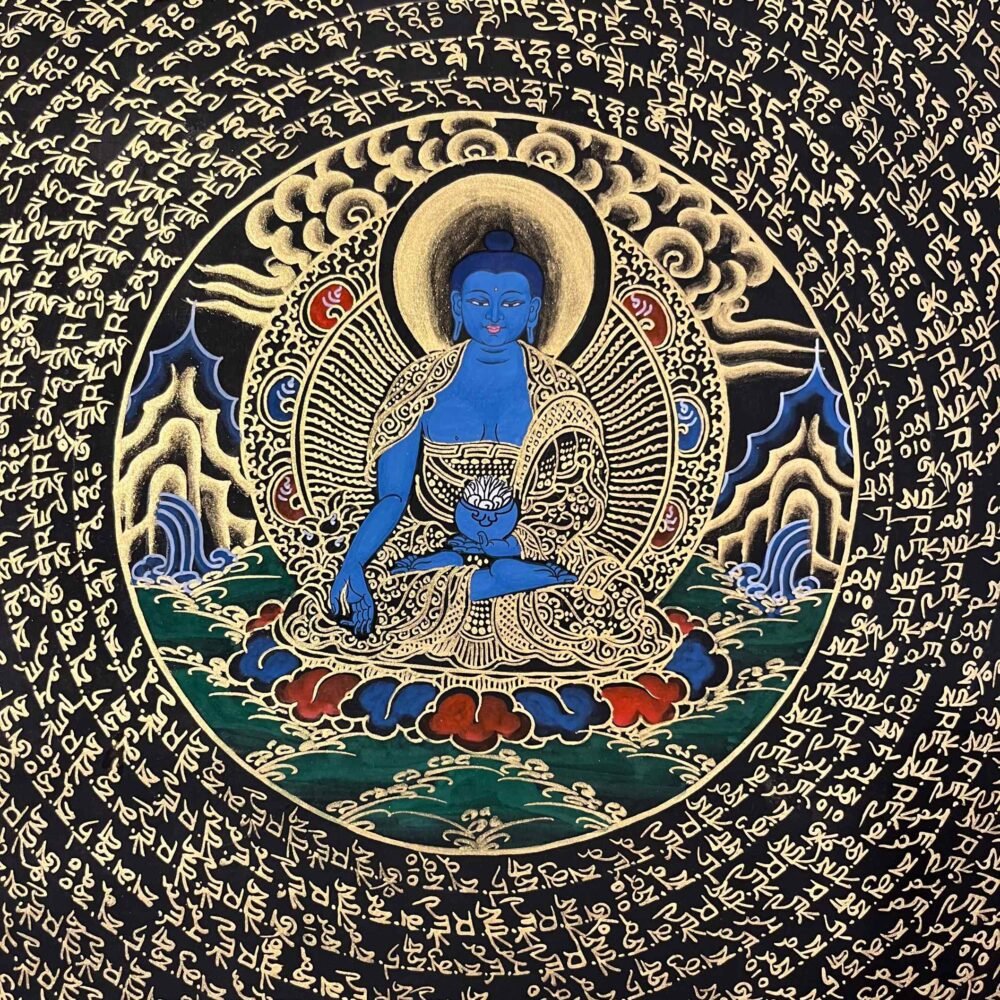A Medicine Buddha Mantra  Thangka painting is a profound piece of Tibetan Buddhist art used for meditation ,healing practices ,and devotional purposes,He is also called the healing Buddha. These artworks are rich in symbolism, typically depicting the deity Bhaisajyaguru, who is revered as the supreme healer capable of alleviating physical, mental, and spiritual suffering.He is said to dispense spiritual medicine when properly worshiped.Medicine Buddha Mantra: Om Bekandze Bekandze Maha Bekandze Radza Samudgate Soha.its means the many sentient beings who are sick, quickly be freed from sickness. And may all the sicknesses of beings Never arise again.