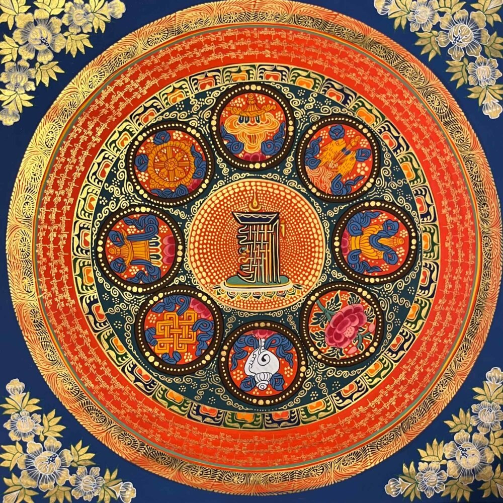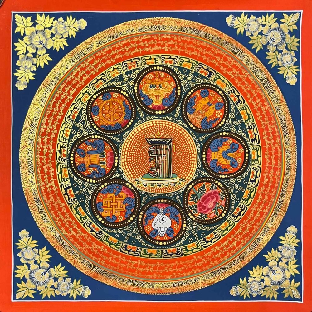 1.The parasol is used as a protection against evil. It is a sign of high dignity. 2.The wheel with the eight spokes embodies the eightfold path to enlightenment. 3.The banner symbolizes the victory of Buddha’s teachings. 4.The golden fishes announce the release from suffering. 5.The vase contains the water of eternity and represents spiritual wealth. 6.The perfect lotus corresponds to purity. 7.The shell-shaped bugle prevents evil from occurring. 8.The infinite knot symbolizes infinite love and a long life.
