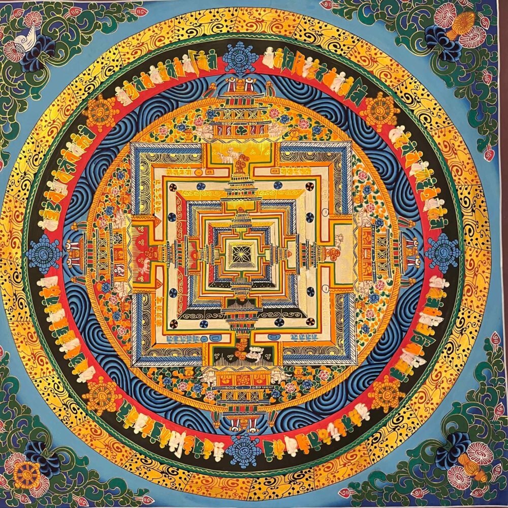 Kalachakra is the combination of two words kala which means time and chakra the endless circle kalachakra is also known as Wheel of time As we see here there are colorful circle there the symbols of six different elements i.e., wisdom, space, wind, fire, water and earth. After crossing these elements. We reach the palace of purity and we can see the three main entrance doors. They are body speech and mind doors continuously. The doors are in four different sides and are colorful. The color shows different directions. At the center we can see a booming lotus flower which is known as nirvana.Kalachakra means “wheel of time” which is design by H.H. Dalai Lama representation of Buddhist Stupa from ariel view.