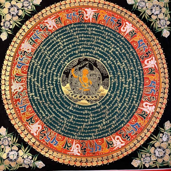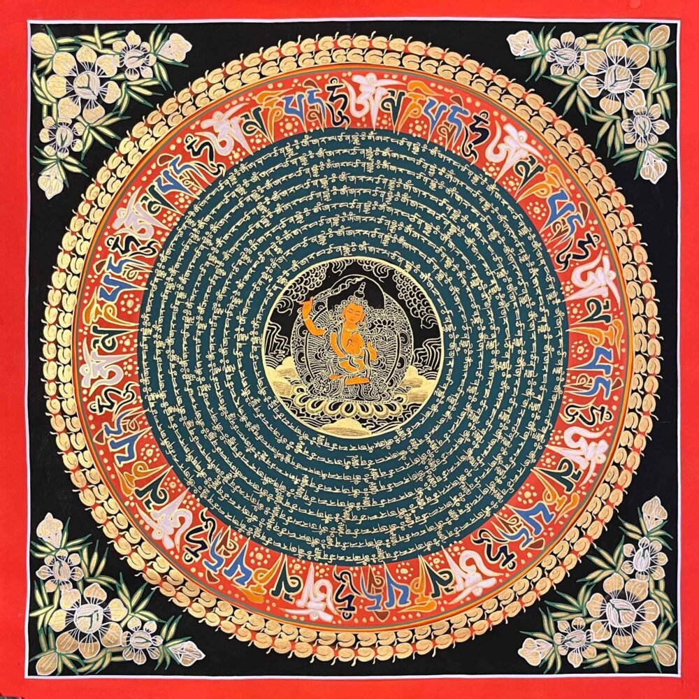 A Manjushree Mantra Mandala Thangka is a sacred Tibetan Buddhist painting featuring the Bodhisattva of wisdom ,manjushree,surrounded by an intricate ,geometric mandala and his mantra ,”Om Ah Ra Pa Tsa Na Dhi”. Handmade by Nepali artisans using natural pigments on cotton canvas, these thangkas are designed for meditation to enhance wisdom, memory, and cognitive clarity. Commonly placed in study rooms, libraries, or altars to cultivate mental sharpness and inner knowledge.