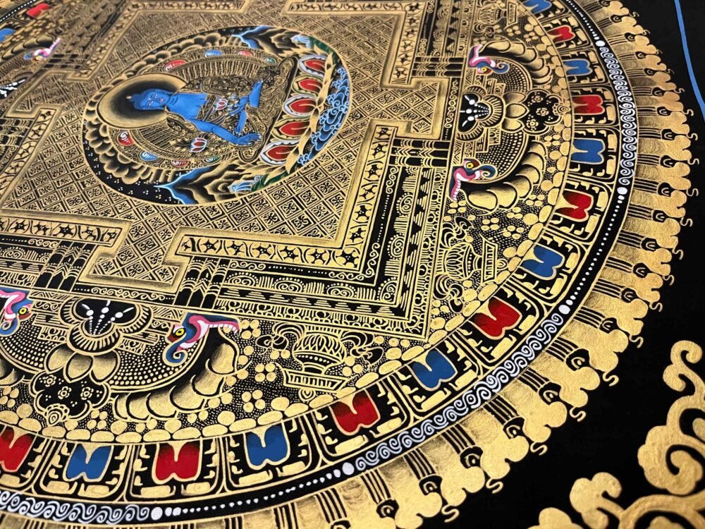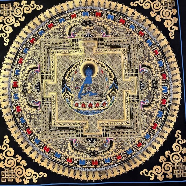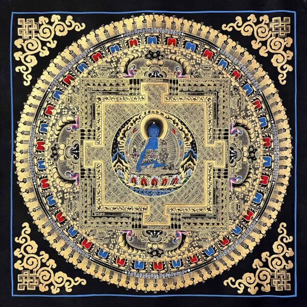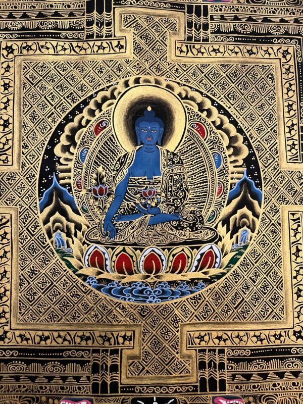 A Medicine Buddha Mandala  Thangka painting is a profound piece of Tibetan Buddhist art used for meditation ,healing practices ,and devotional purposes,He is also called the healing Buddha. These artworks are rich in symbolism, typically depicting the deity Bhaisajyaguru, who is revered as the supreme healer capable of alleviating physical, mental, and spiritual suffering.He is said to dispense spiritual medicine when properly worshiped.Medicine Buddha Mantra: Om Bekandze Bekandze Maha Bekandze Radza Samudgate Soha.its means the many sentient beings who are sick, quickly be freed from sickness. And may all the sicknesses of beings Never arise again.The surrounded mantras .