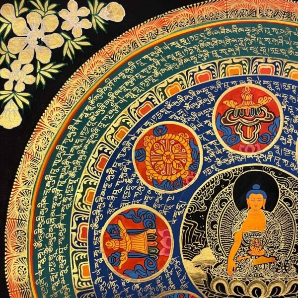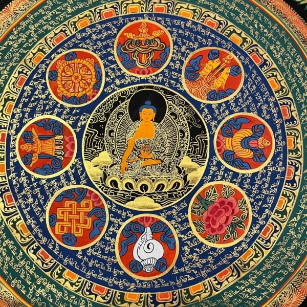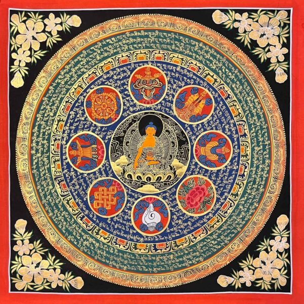 A Shakyamuni Buddha Mantra Mandala Thangka is sacred Tibetan Buddhist painting depicting Siddhartha Gautam at the center of cosmic diagram representing the path to enlightment, featuring his serene form surrounded by symbolic elements like the Eight Auspicious Symbols, Dhyani Buddhas, or celestial realms, hand-painted on cotton with natural mineral pigments for meditation and spiritual focus. These thangkas serve as visual guides for contemplation, illustrating the interconnectedness of the universe and the Buddha’s teachings on wisdom and compassion.A Shakyamuni Buddha Mantra ” TADYATHA OM MUNE MUNE MAHAMUNAYE SOHA”.