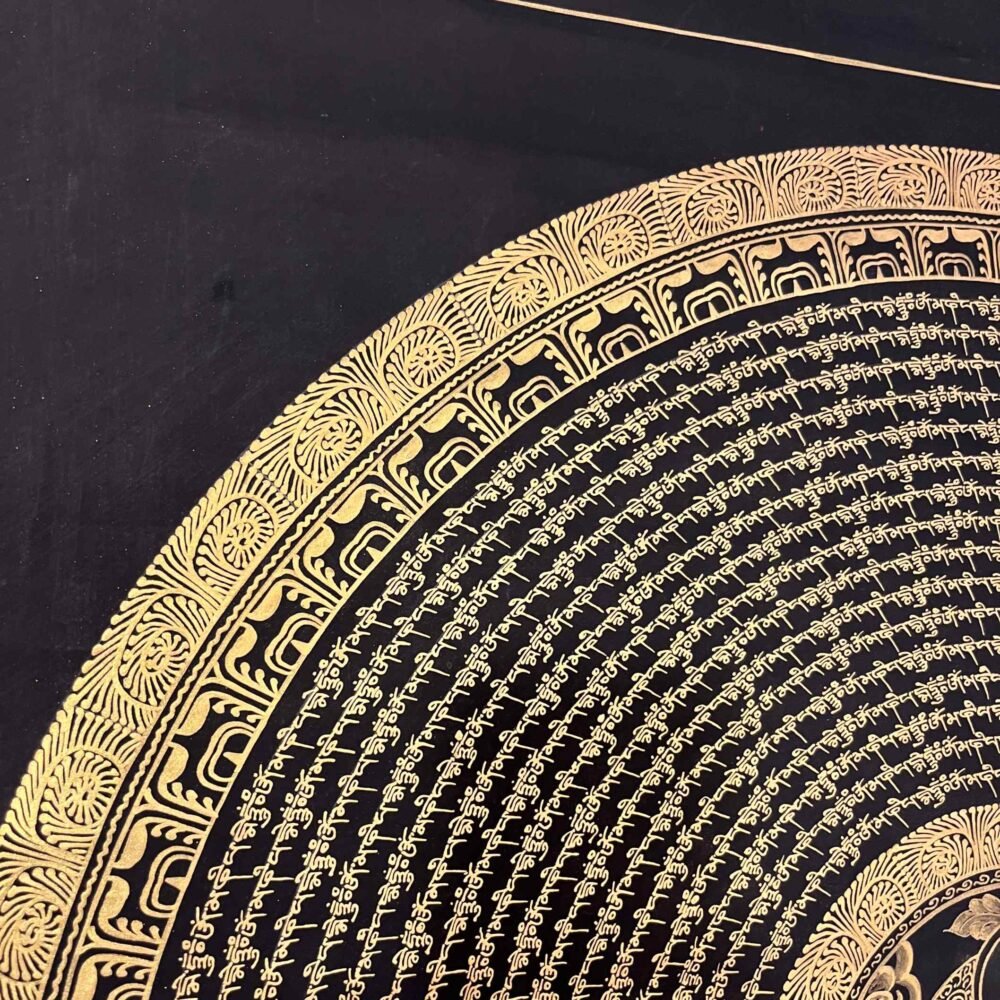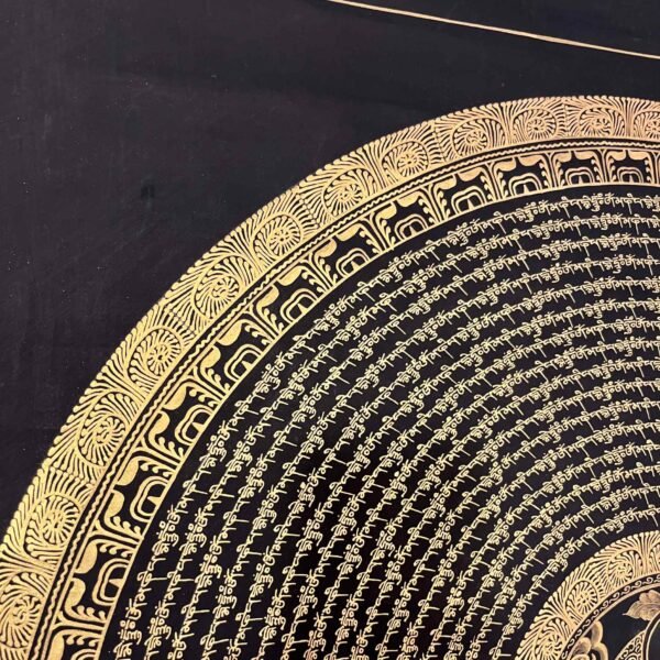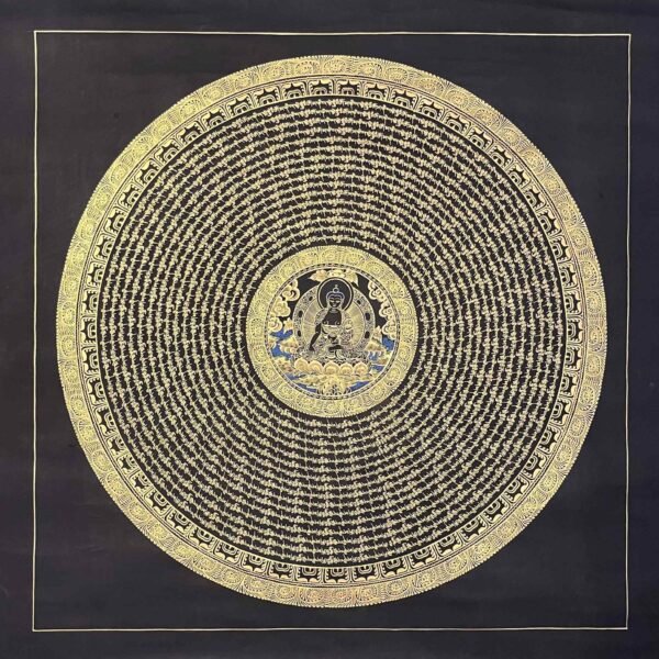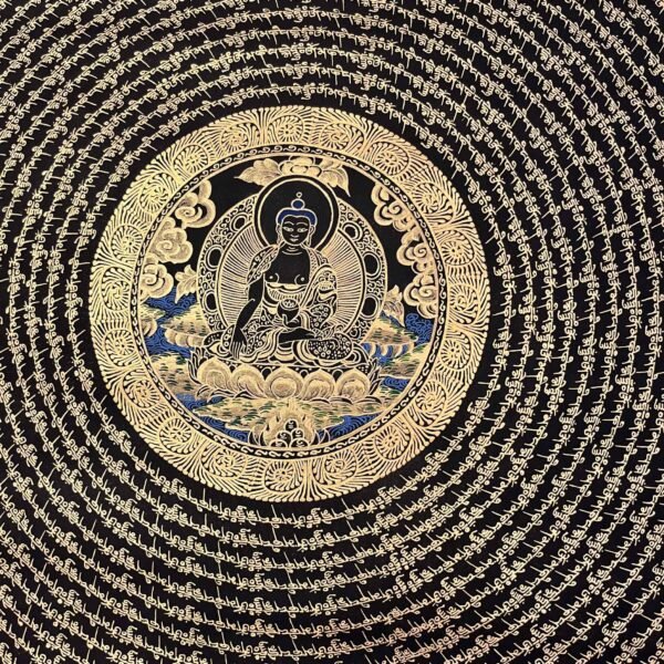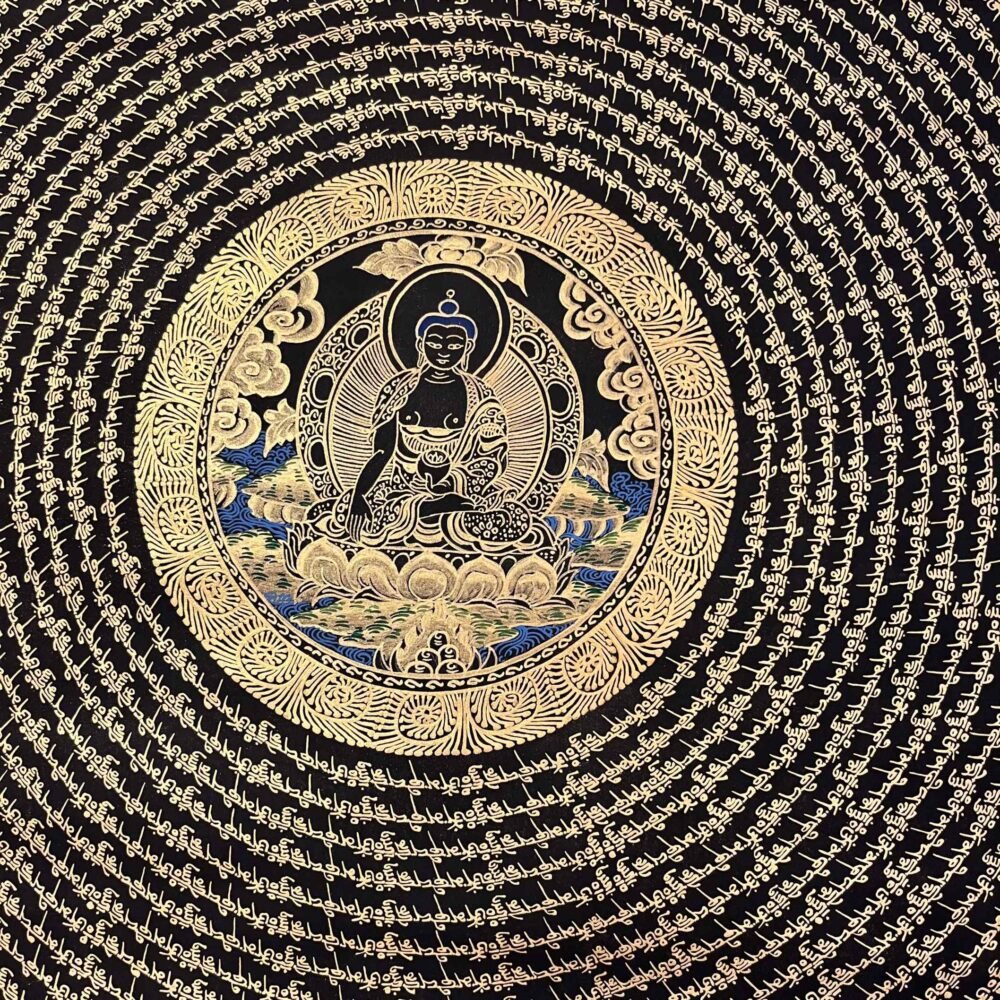 A Shakyamuni Buddha Mantra Mandala Thangka is sacred Tibetan Buddhist painting depicting Siddhartha Gautam at the center of cosmic diagram representing the path to enlightment, featuring his serene form surrounded by symbolic elements like the Eight Auspicious Symbols, Dhyani Buddhas, or celestial realms, hand-painted on cotton with natural mineral pigments for meditation and spiritual focus. These thangkas serve as visual guides for contemplation, illustrating the interconnectedness of the universe and the Buddha’s teachings on wisdom and compassion.A Shakyamuni Buddha Mantra TADYATHA OM MUNE MUNE MAHAMUNAYE SOHA.