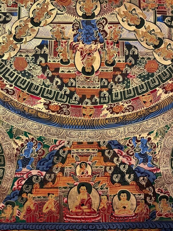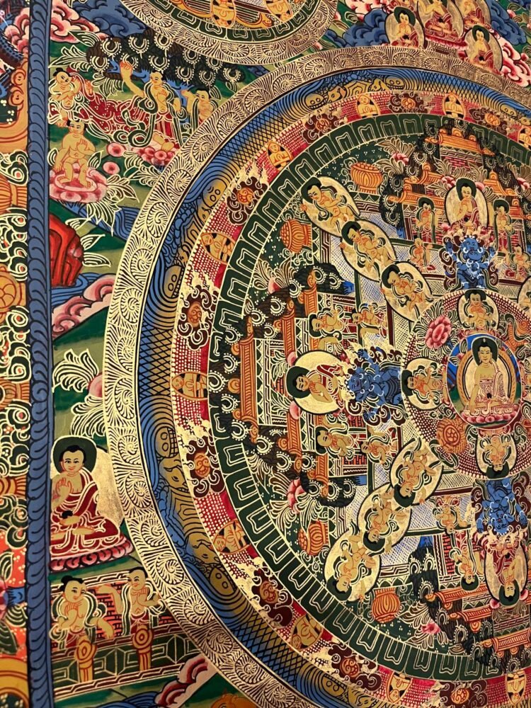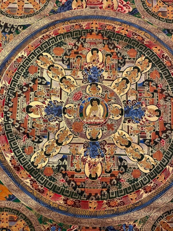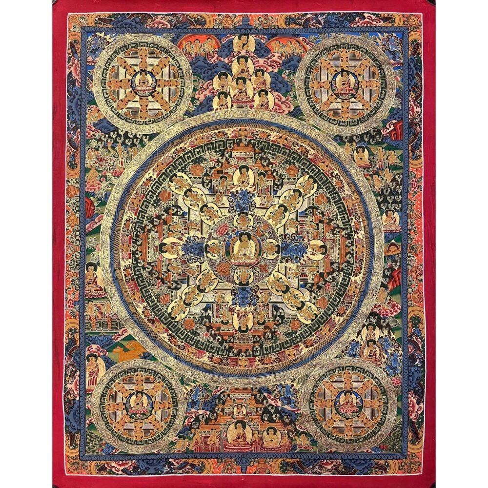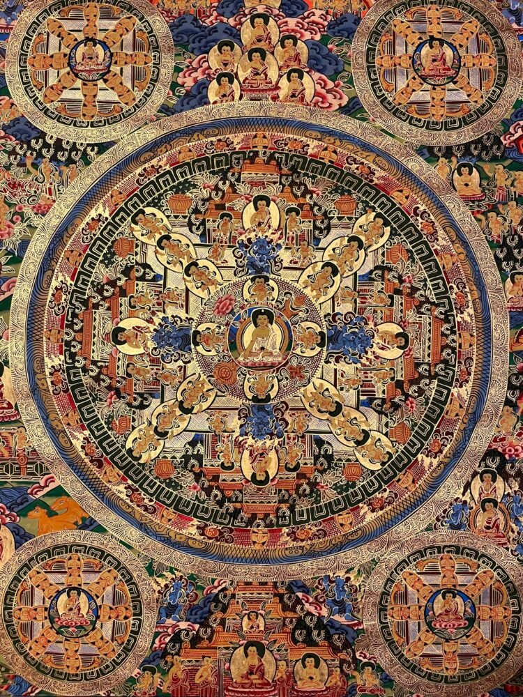 Mandala, a circle that is a device for the Tantric meditation. It is visual aid for concentration and introversive meditation leading to the attainment of insights and to activation of forces culminating in “Siddhi”, supernatural forces. The mandala is the graphic representation of this process. It is not only theoretical but practical also as an instrument (yantra). There are many types and varieties of mandalas depending on the nature of central deity. The most classic pattern of mandalas are of Dhyani Buddha. This mandala represents “Palace of Purity” a magic surrounded by circle of flame, vajra, eight centuries (appears only with wrathful deities), lotus and then the inner square to reach of the dity of the mandala. Structure: Generally, mandala is sketched inside circles. Those circles are of four types: Flame of burning fire, Cremation, Wind and Lotus flower (sometimes vajara in the case of wind). The flame of burning fire is the sign of the destroyer of impurity and unknowledge contained in us. After the circle of cremation, there’s a circle of Vajra, is the sign of knowledge or enlighten and no difficulties or problems can shake the knowledge. After crossing these four circles a square room appears which is the sign of the spiritual temple. There are four entrances- gates in four different directions. The God or
