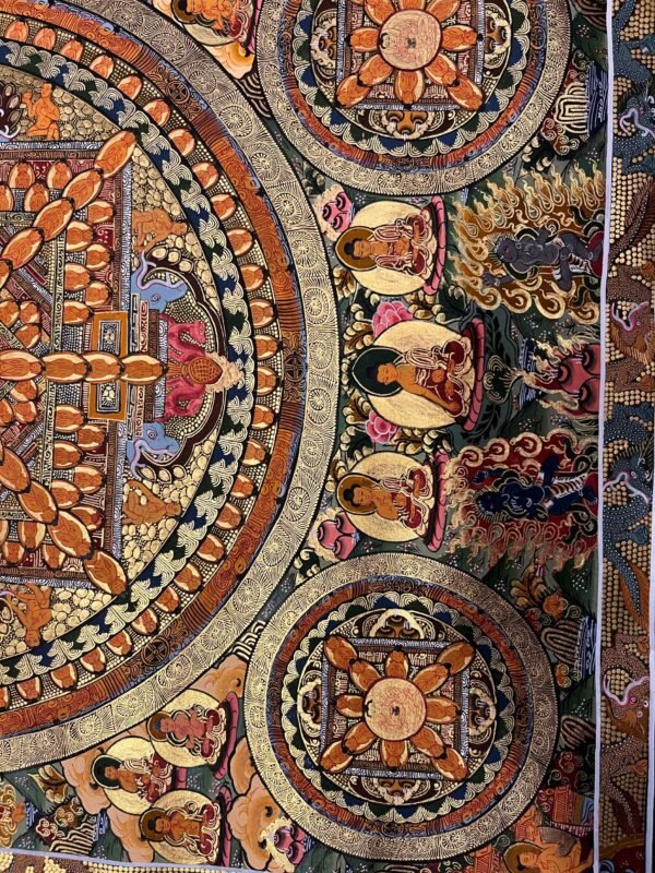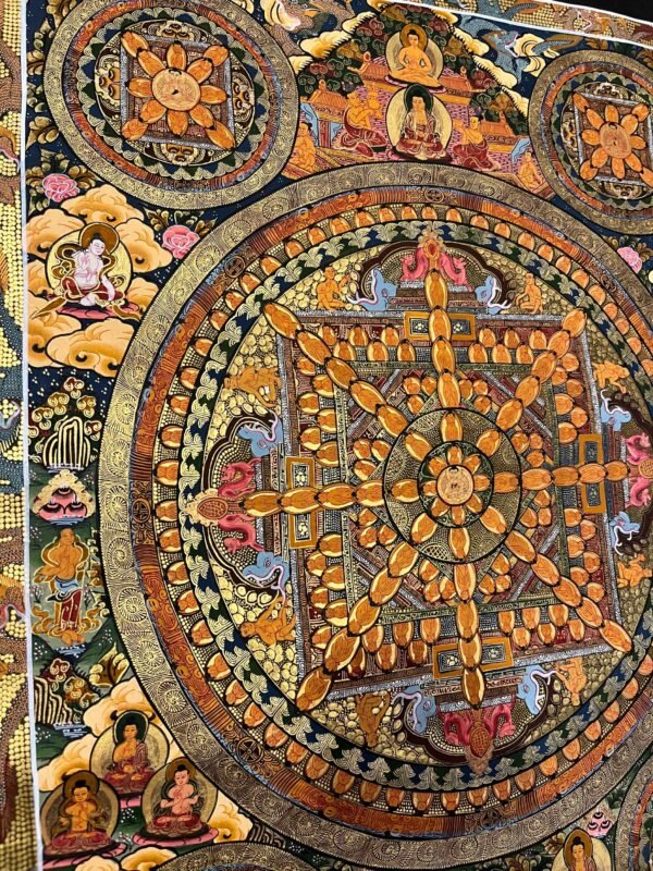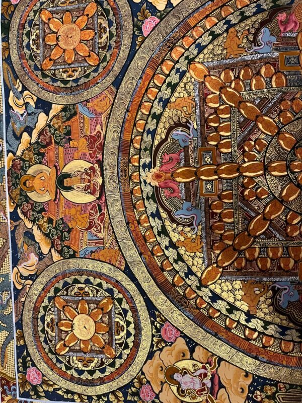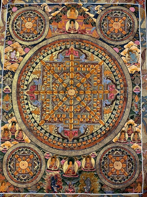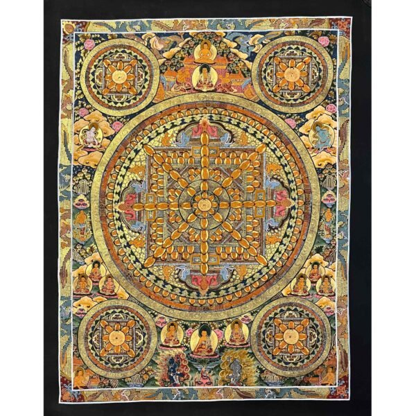 Mandala, a circle that is a device for the Tantric meditation. It is visual aid for concentration and introversive meditation leading to the attainment of insights and to activation of forces culminating in “Siddhi”, supernatural forces. The mandala is the graphic representation of this process. It is not only theoretical but practical also as an instrument (yantra). There are many types and varieties of mandalas depending on the nature of central deity. The most classic pattern of mandalas are of Dhyani Buddha. This mandala represents “Palace of Purity” a magic surrounded by circle of flame, vajra, eight centuries (appears only with wrathful deities), lotus and then the inner square to reach of the dity of the mandala. Structure: Generally, mandala is sketched inside circles. Those circles are of four types: Flame of burning fire, Cremation, Wind and Lotus flower (sometimes vajara in the case of wind). The flame of burning fire is the sign of the destroyer of impurity and unknowledge contained in us. After the circle of cremation, there’s a circle of Vajra, is the sign of knowledge or enlighten and no difficulties or problems can shake the knowledge. After crossing these four circles a square room appears which is the sign of the spiritual temple. There are four entrances- gates in four different directions. The God or