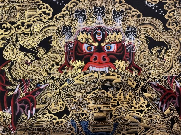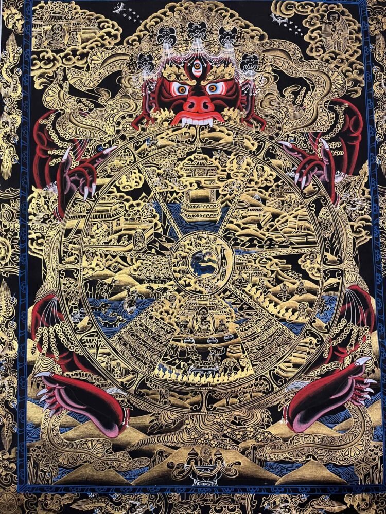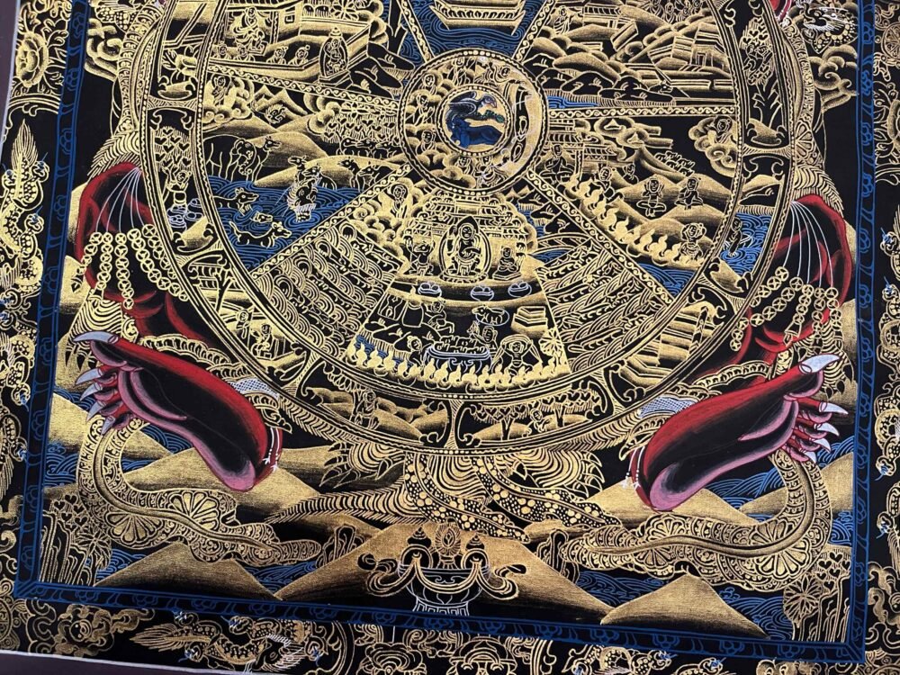 A big wheel is in the grip of “Yama” the lord of death or lode of impermanence, who is biting and tearing apart Inside the wheel there are six (Sometime just five) main segments which represents different realms that living beings are reborn into different states of mind that we can find. We are trapped in times. The ‘Heavenly realms are at the top of them jealous gods, Animal, Human being, Hungry Ghosts and the different “Hellish” states at the bottom.
