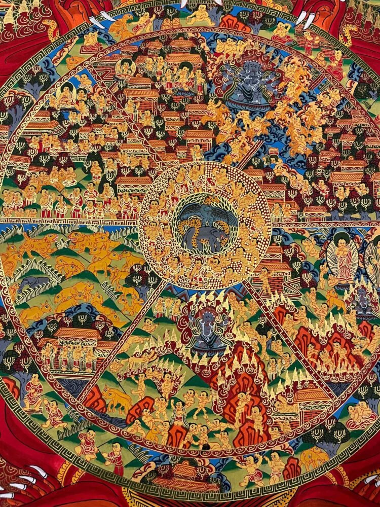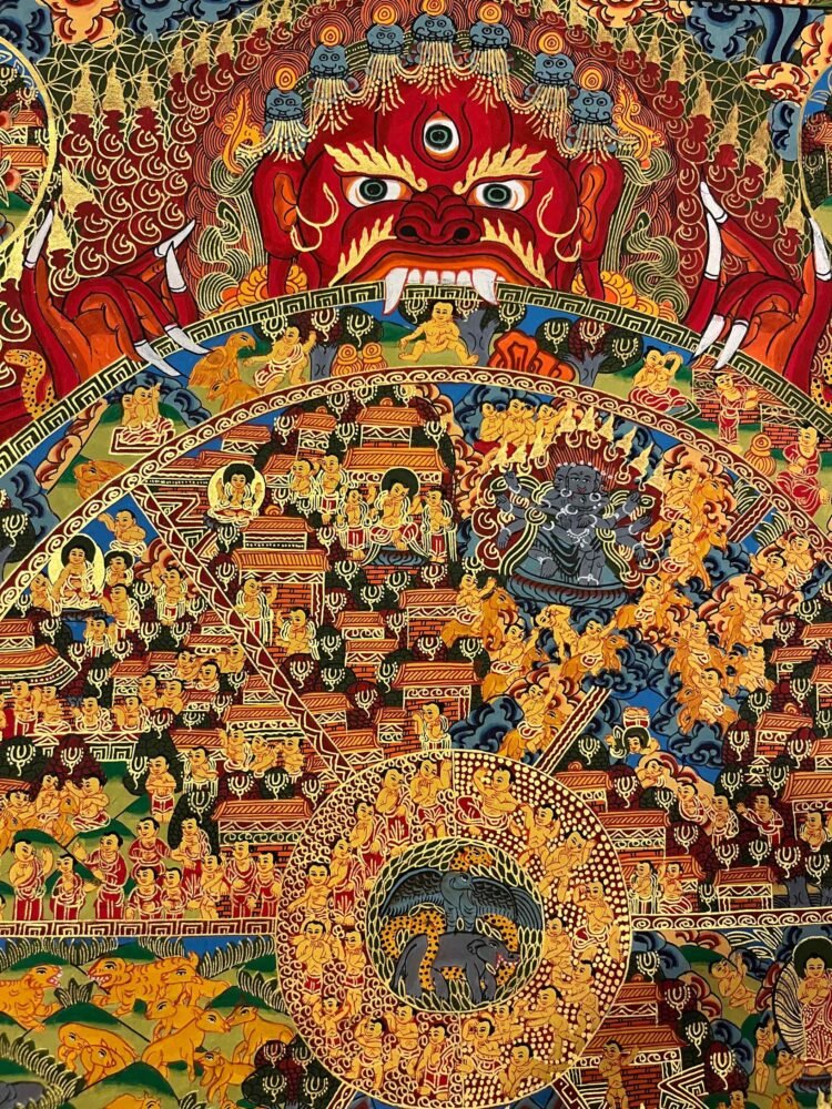 A big wheel is in the grip of “Yama” the lord of death or lode of impermanence, who is biting and tearing apart Inside the wheel there are six (Sometime just five) main segments which represents different realms that living beings are reborn into different states of mind that we can find. We are trapped in times. The ‘Heavenly realms are at the top of them jealous gods, Animal, Human being, Hungry Ghosts and the different “Hellish” states at the bottom.