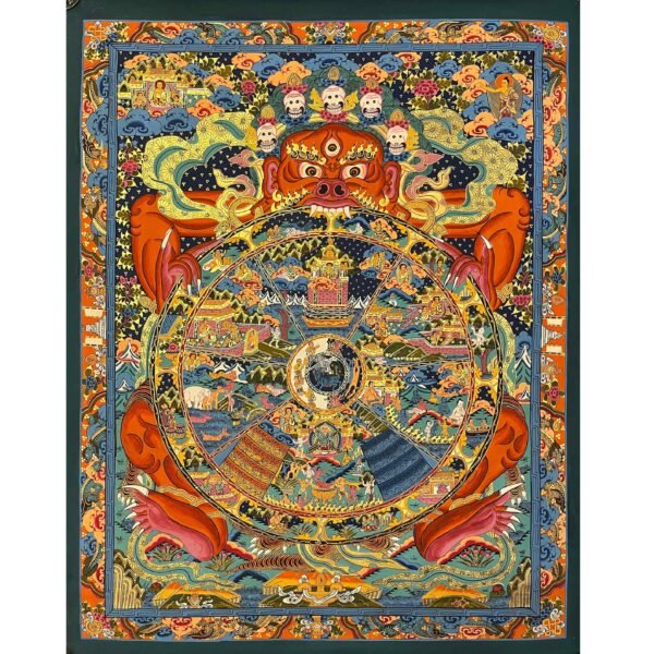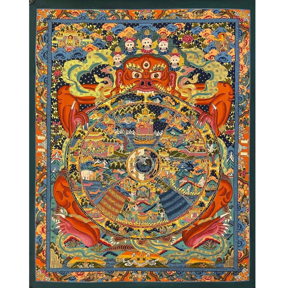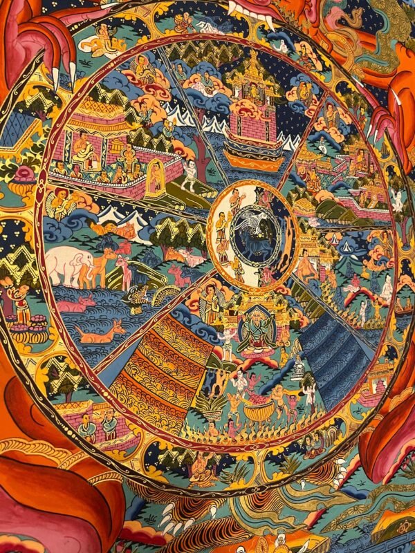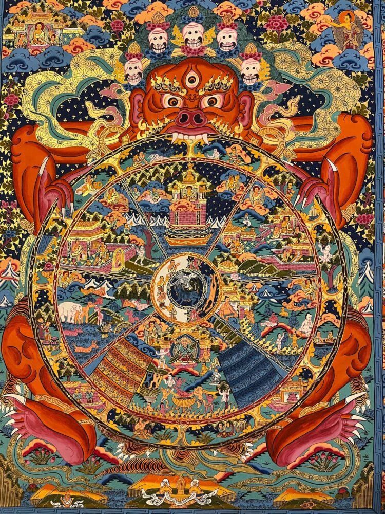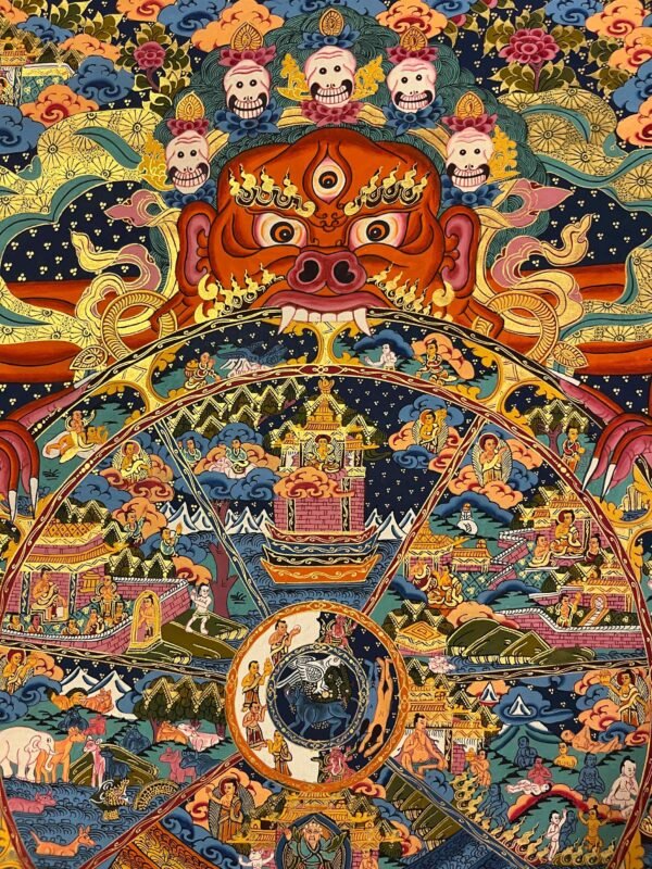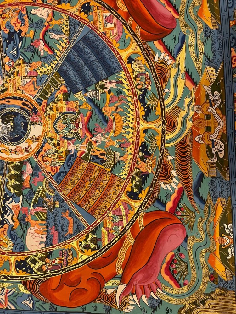 A big wheel is in the grip of “Yama” the lord of death or lode of impermanence, who is biting and tearing apart Inside the wheel there are six (Sometime just five) main segments which represents different realms that living beings are reborn into different states of mind that we can find. We are trapped in times. The ‘Heavenly realms are at the top of them jealous gods, Animal, Human being, Hungry Ghosts and the different “Hellish” states at the bottom.