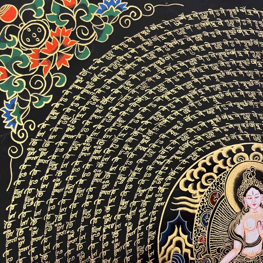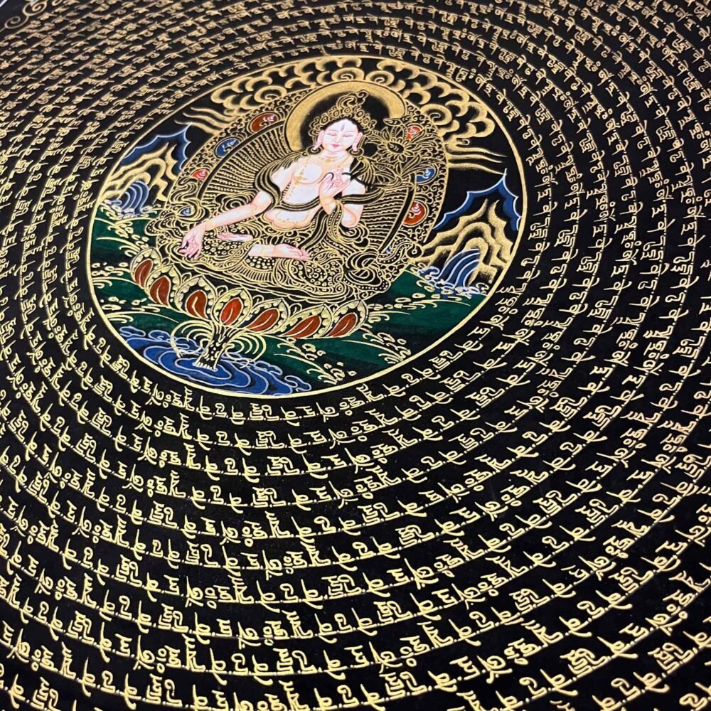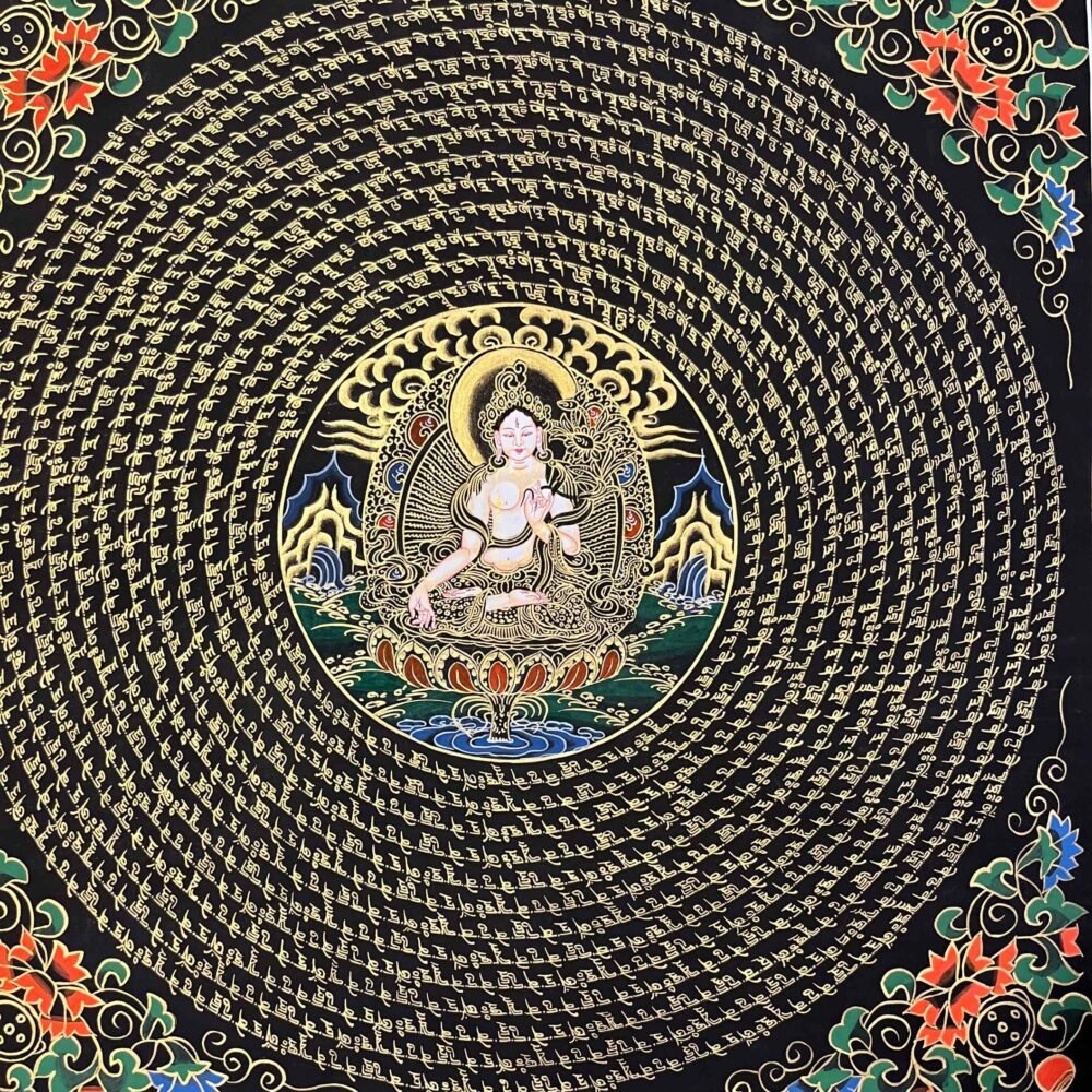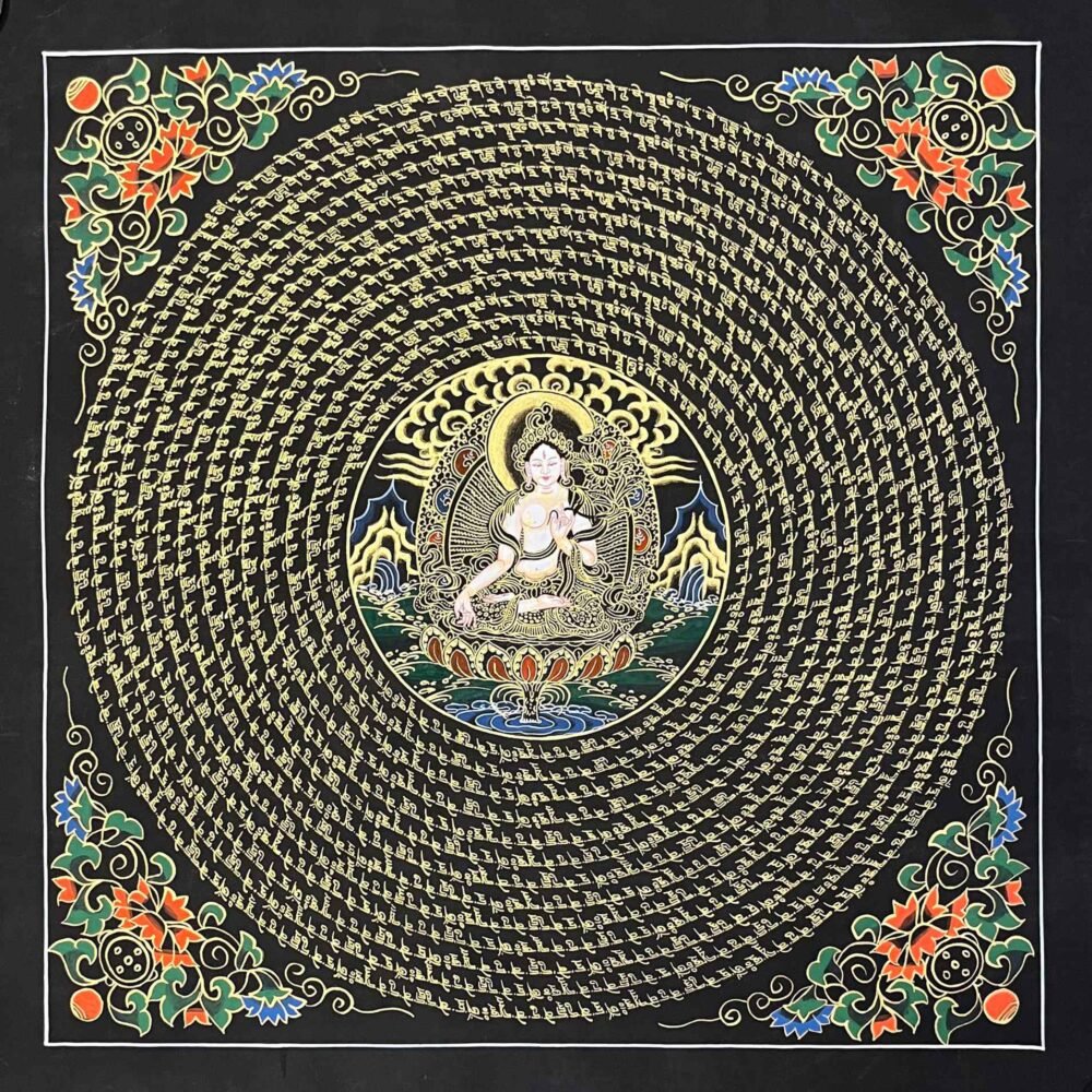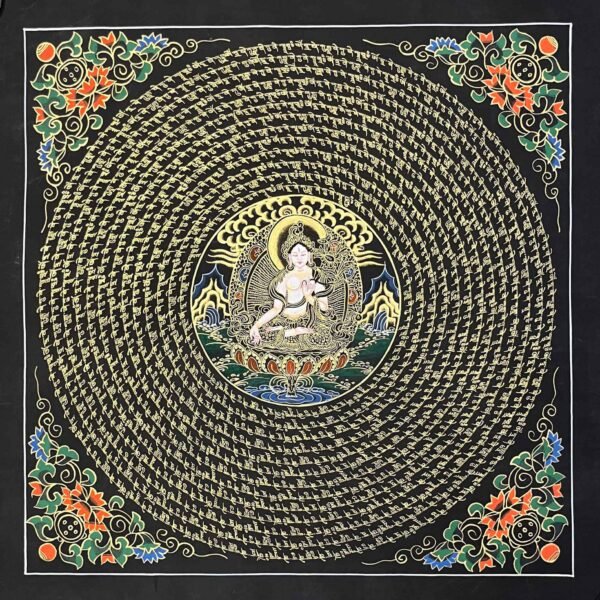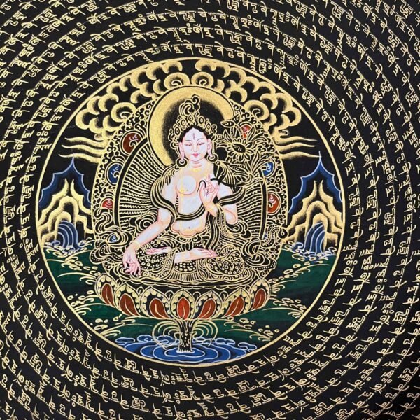 A White Tara Mantra Mandala Thangka is a sacred Tibetan painting featuring the goddess of compassion, health, and longevity at the center, surrounded by her mantra and intricate geometric patterns. Used for meditation, these artworks are believed to purify the soul, provide healing, and enhance spiritual, mental, and physical well-being.