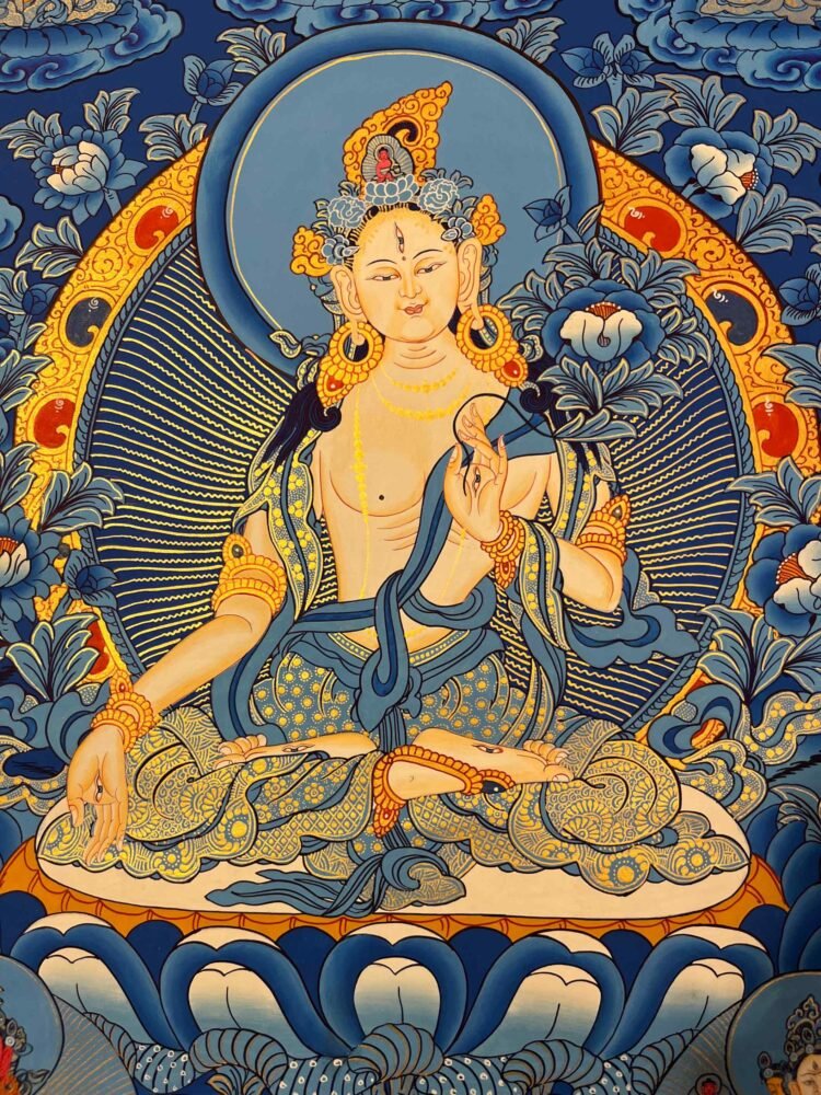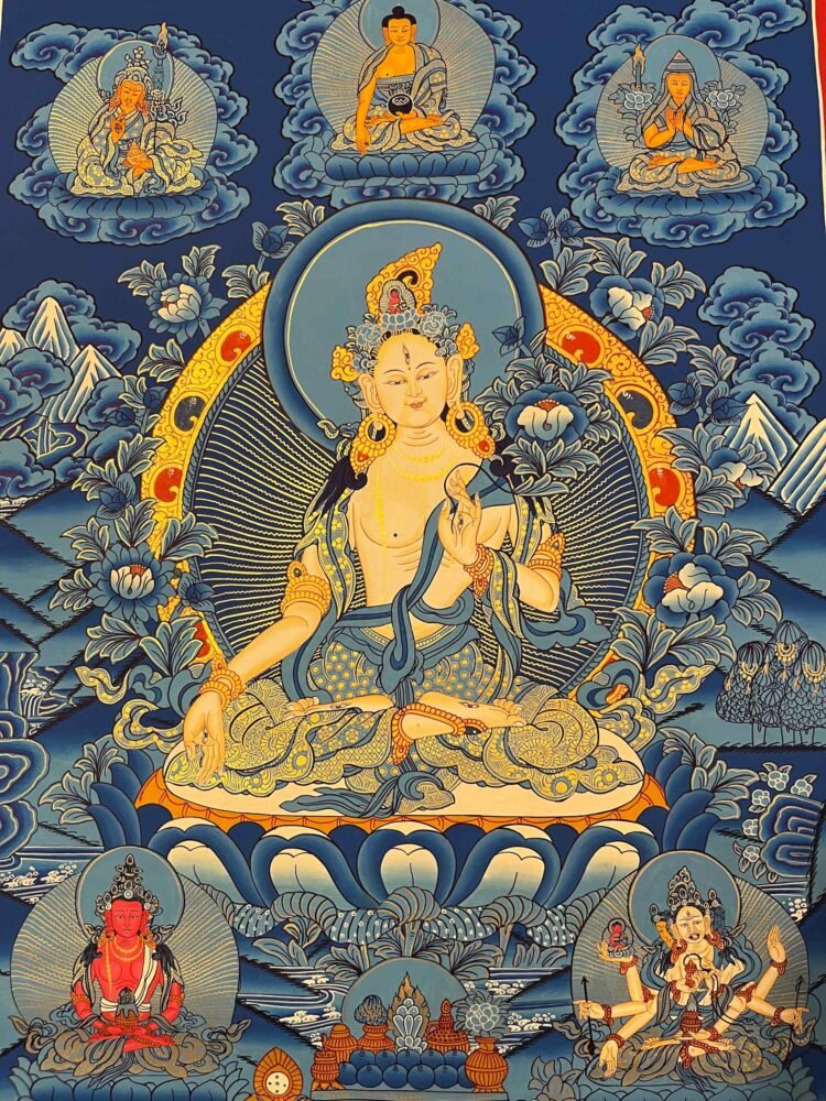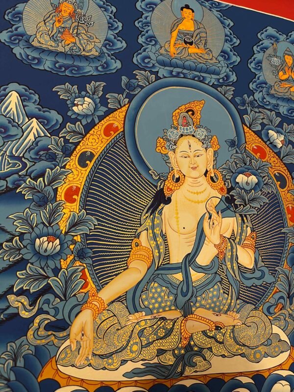 A White Tara Thangka painting is a traditional Tibetan Buddhist artwork that depicts the female Bodhisattva known for compassion,healing ,and granting ,longevity. The paintings feature specific iconography, such as her seven eyes, to symbolize her all-seeing awareness of suffering and readiness to help all beings. the female Bodhisattva of compassion, is meaningful to those practicing spirituality and meditation, as well as for decorative purposes. Quality craftsmanship is evident in each Thangka painting, crafted on cotton canvas with the use of natural stone colors, gold, silver, and semi-precious minerals. Meditation with White Tara has the potential to purify and transform the body, speech, and mind. White Tara is the mother of all Buddhas, also known as Female Buddha and the goddess of love and healing of the Tibetan Buddhist tradition. She is depicted seating in lotus position with the soles of her feet pointing upward. Her left hand holds a beautiful blue lotus flower and her right hand is extended to her knee in the mudra of compassion.